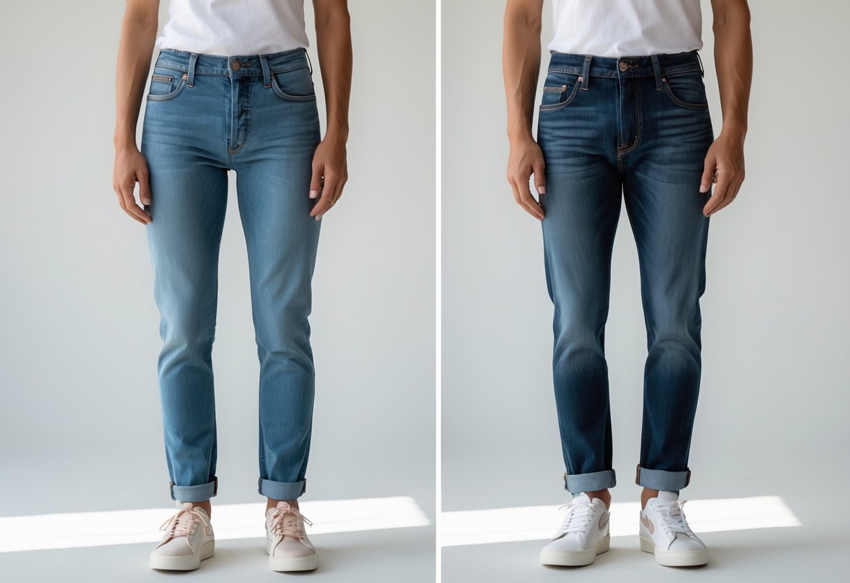 - Skirtumas nuo slim fit: Slim fit džinsai yra aptakesni per visą koją, o carrot fit – labiau erdvūs viršuje.