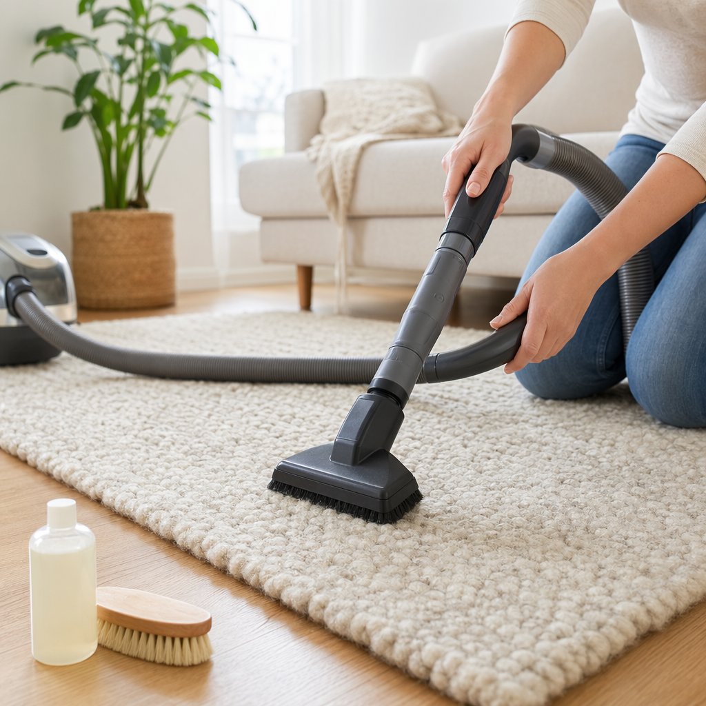 Rankos valo dėmę vilnoniame kilime naudojant minkštą šepetį ir valymo priemones šviesioje patalpoje.