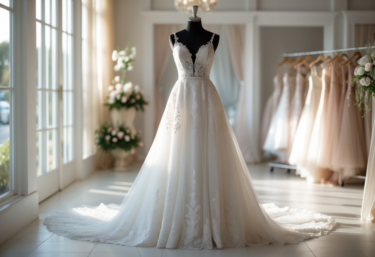 Vestuvinės suknelės parduotuvės vidus su baltu vestuvinės suknelės manekenu ir drabužių kabykla fone.