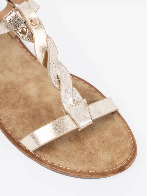 Auksinės pynimo basutės ne tik gražios, bet ir patogios dėvėti visą dieną. Platus diržas su ajustavimo sistema užtikrina jų prisitaikymą prie įvairių pėdos formų, o komfortiška vidpadė užtikrina maksimalų patogumą einant. Basutės pakelta kulno dalis leidžia palaikyti natūralią pėdos padėtį, todėl mažėja nuovargis net ir po ilgos vaikščiojimo dienos.