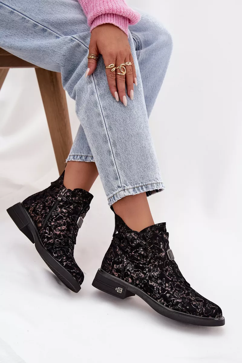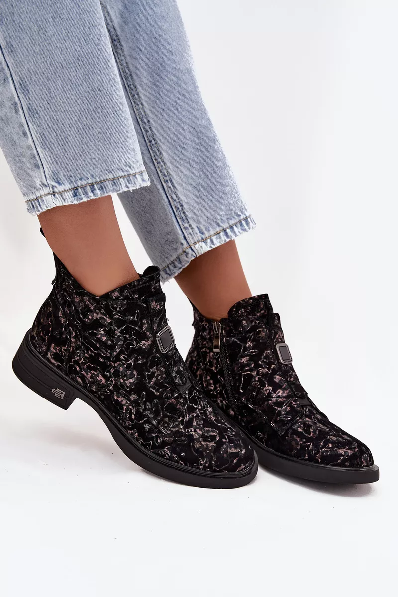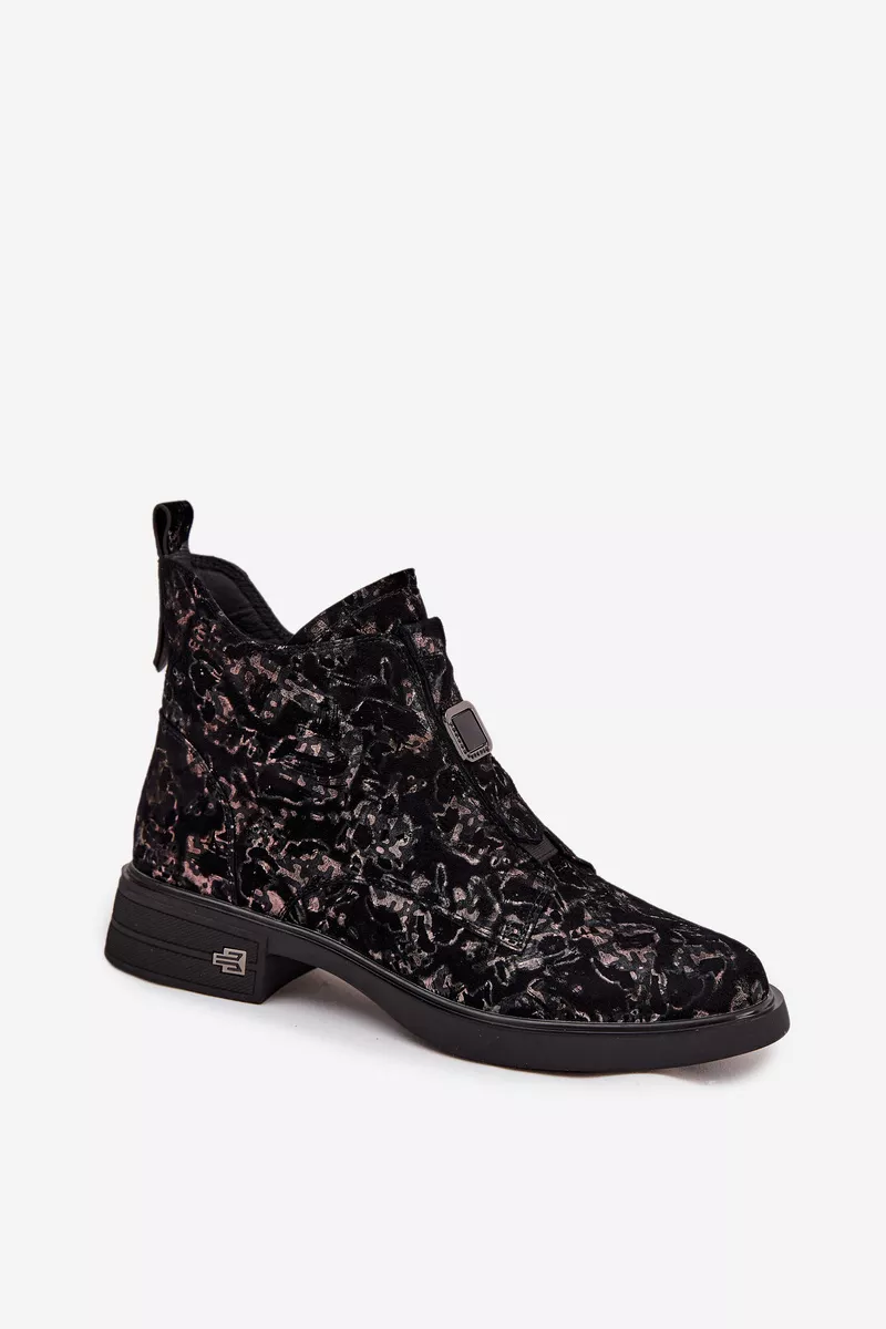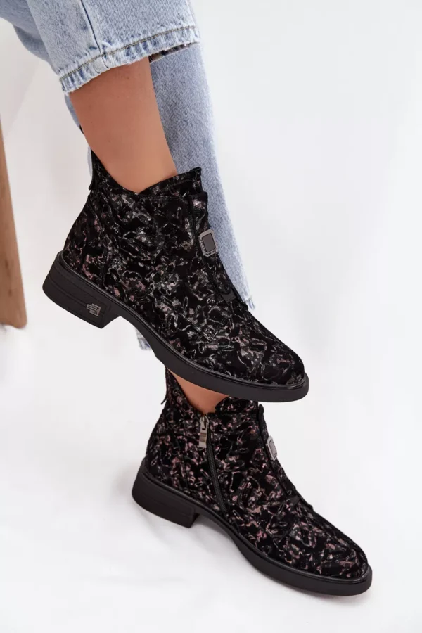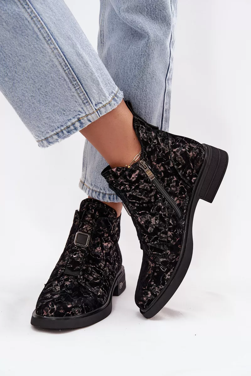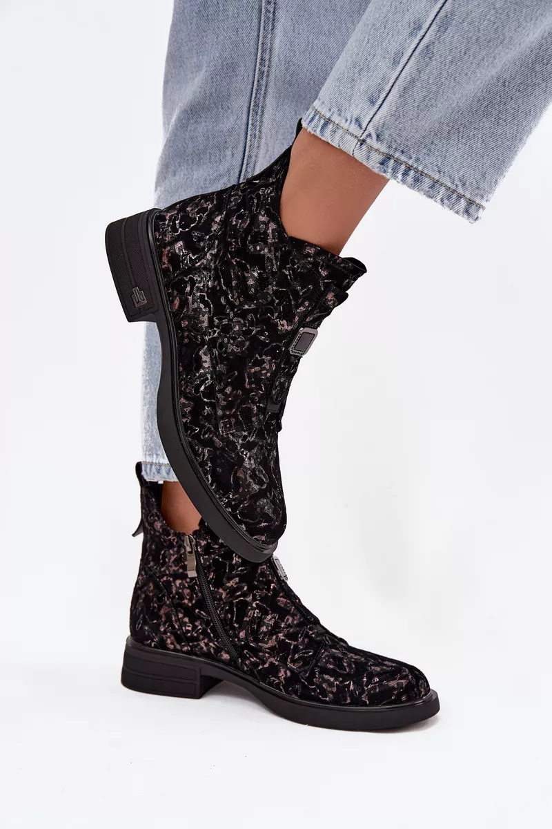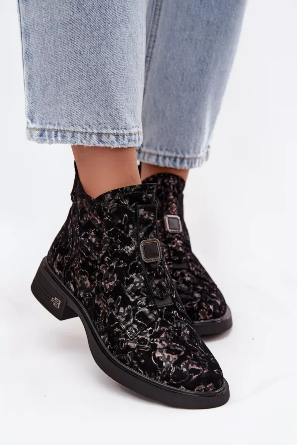 Šie eleganti moterų botai iš natūralaus veliūro yra puikus pasirinkimas moterims, vertinančioms stilių ir patogumą. Žemas kulniukas suteikia stabilumo ir komforto, todėl šis modelis puikiai tinka kasdieniam naudojimui. Užtrauktukas palengvina batų apsiaustymą, o minkšta izoliacija garantuoja šilumą šaltesnėmis dienomis. Dekoratyvinis elementas priekyje pritraukia dėmesį ir suteikia elegancijos išskirtinumo, pabrėžiančio batų unikalų charakterį. Šie botai yra ideali elegantiškų rudens ir žiemos aprangų papildymas.