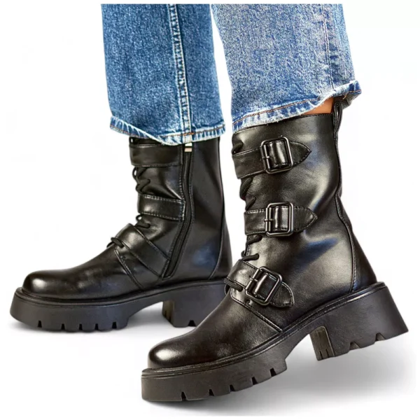 Aukšti juodi moteriški baggeriai su sagtimis moteriški motociklininko batai