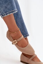 Moteriški baleriniai bateliai, pagaminti iš minkšto eko zomšos. Plokščiapadis modelis garantuoja visos dienos komfortą, o švelniai suapvalinti priekiai suteikia subtilaus, moteriško charakterio. Per vidurį yra dirželis su auksine sagtimi, kuri traukia akį ir suteikia elegantišką užbaigimą. Minkštas vidpadis užtikrina patogumą vaikštant. Tai klasikiniai, bet stilingi baleriniai bateliai, tinkantys įvairioms progoms – nuo kasdienių iki elegantiškesnių. Puikiai tinka darbui, susitikimams ar pasivaikščiojimams. Rinkdamiesi dydį, vadovaukitės dydžių lentele.