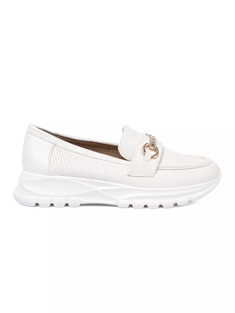 Prestižinės baltos moksasinos su auksiniu dekoratyviniu elementu
