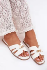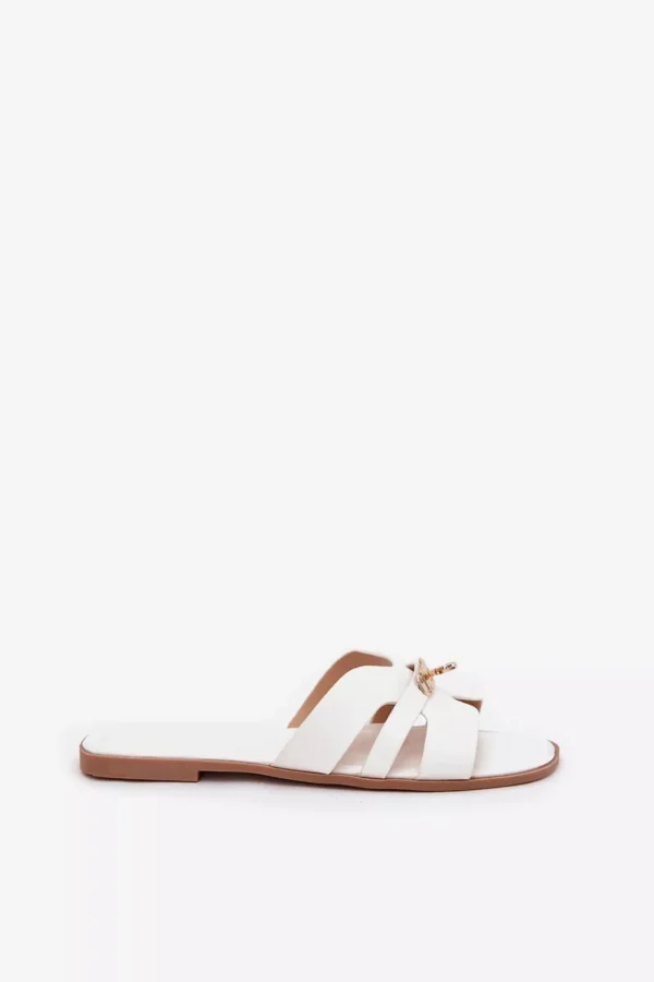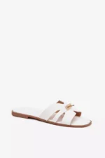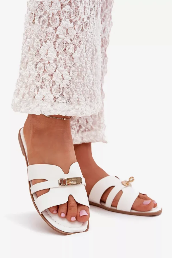 Šio modelio grožis slypi detalėse – elegantiškoji juostelė, dekoruota auksiniu motyvu, iškart patrauks akį ir suteiks išskirtinio stiliaus bet kokiam deriniui. Balta spalva, papildyta aukso detalėmis, puikiai tiks prie daugelio jūsų vasaros garderobo daiktų.