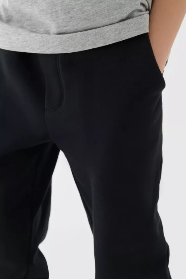 Berniukai treniginės kelnės joggeriai puikiai tiks tiek prie laisvalaikio, tiek prie sportinių kasdienių stilių. Jos yra klasikinio kirpimo, patogiai priglundančios prie figūros, su siaurėjančiomis klešnemis, užbaigtomis elastine juosta. Viensluoksnis „single jersey“ audinys su viena lygiu paviršiumi daro jas elastingas ir patogias dėvėti. Vaikiškos treniginės kelnės pagamintos iš 80% medvilnės, todėl yra minkštos, patvarios ir malonios liesti. Poliesterio (20%) priedas leidžia audiniui išlaikyti formą ir yra atsparus dilimui net daugelį sezonų. Šukuotas vidus garantuoja papildomą šilumą, todėl kelnės puikiai tiks vėsesnėms dienoms. Šonuose yra 2 atviros kišenės. Papildomai, cargo tipo kišenė dešiniojo šlaunies išorėje. Ant klešnės yra užrašas “Choose Your Own Sphere”. Elastingas juosmuo su išorine raištelių reguliavimo sistema.
