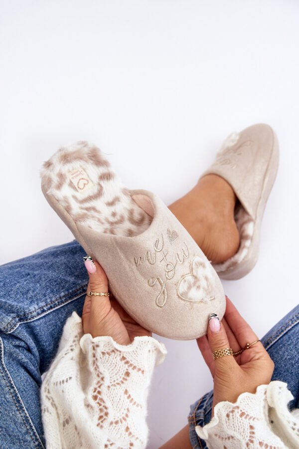 Blizgūs moteriški šlepetės, puošti užrašu ir širdimi. Įliekamas modelis su uždaromu priekiu. Montuojamas ant storo pado. Vidpadis apšiltintas dirbtiniu kailiu. Renkantis dydį, vadovaukitės dydžių lentele.