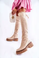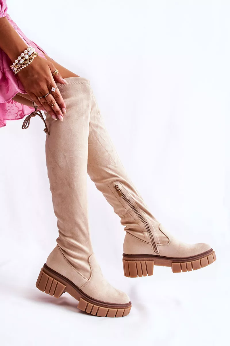 Gražūs moteriški ilgaauliai batai, siekiantys virš kelių. Modelis pagamintas iš malonaus liesti eko zomšo. Užsegami šoniniu užtrauktuku. Papildomai batai turi raištelius, kurių dėka juos galima tinkamai priderinti. Modelis su masyviu plokščiu kulniuku ir platforma. Batai turi apšildymą – aulo aukštyje tik pėdos dalyje yra specialus apšildantis paklotas. Sutvirtintas kulno užkulnis. Renkatės dydį, vadovaukitės dydžių lentele.