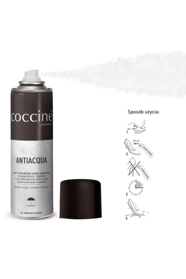 Paruošimas ir naudojimas yra itin paprastas. Pirmiausia, nuvalykite batus pagal gamintojo rekomendacijas, užtikrindami švarų paviršių. Tuomet tolygiai purkškite Coccine Antiacqua ant batų paviršiaus iš maždaug 25 cm atstumo, vengdami purkšti ant kulnų. Leiskite priemonei kruopščiai išdžiūti – prireikus, procesą galima kartoti. Prieš pirmą naudojimą rekomenduojama išbandyti priemonės poveikį ant nedidelės, nematytos avalynės dalies. Jei priemonės bus panaudota per daug, gali susidaryti lengva plėvelė, todėl svarbu laikytis rekomendacijų. Kad apsauga išliktų maksimali, rekomenduojama ją atnaujinti prieš kiekvieną kelionę į lietingą ar snieguotą dieną.