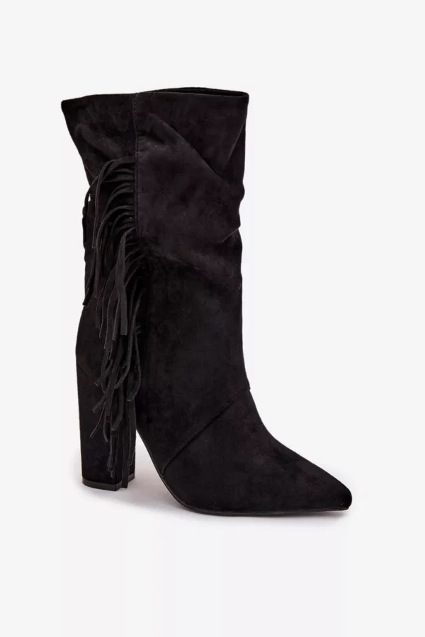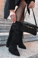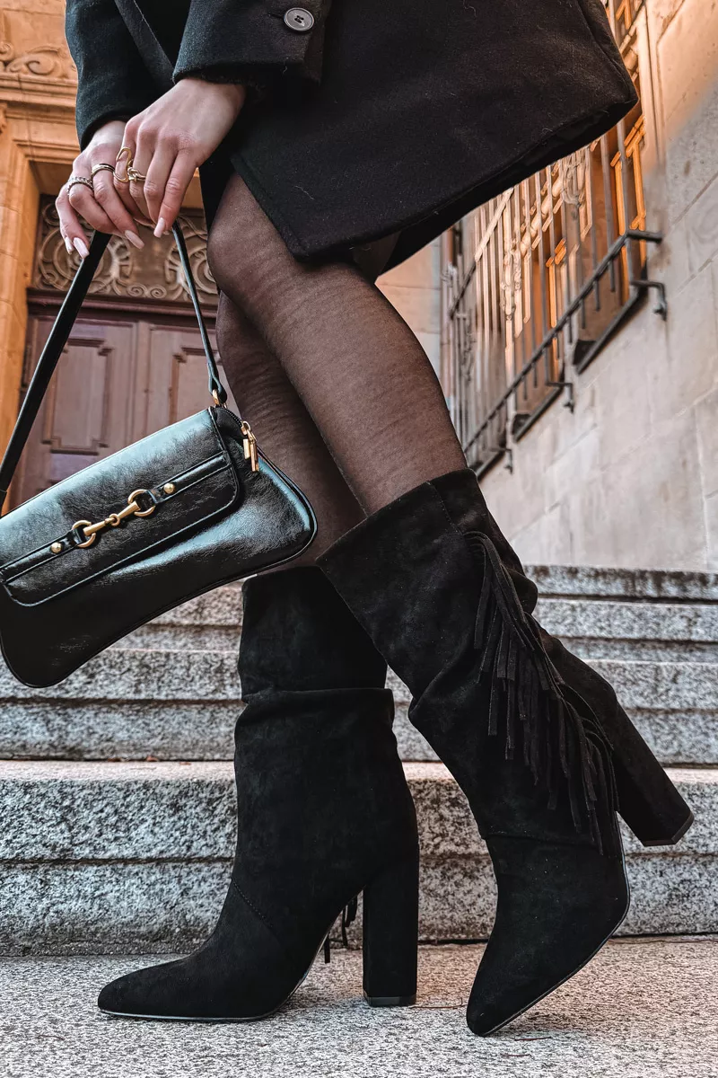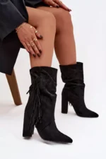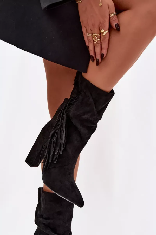 Darlina juodi izoliuoti moteriški batai ant kulno su dekoro elementais ir raukiniais – ne tik madingas, bet ir praktiškas pasirinkimas jūsų garderobui. Bateliai pagaminti iš minkštos zomšos, kuri yra draugiška aplinkai, tad jūsų kojos bus apsaugotos tiek nuo šalčio, tiek nuo nepalankaus oro, išlaikant natūralų pralaidumą. Šie batai su siauru nosimi ir stabilus kulnas suteikia elegancijos ir išryškina jūsų kojų linijas.