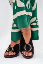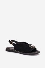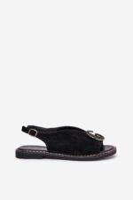 Būkite pirmas aprašęs “Eleganti moteriškos basutės su auksine apdaila ant plokščio kulno juodos S.Barski KV27-053”
