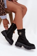 Moteriški aulinukai (workery) – tai miesto stiliaus ir patogumo derinys. Minkšta avalynės fliso medžiaga apšiltintas modelis užtikrina šilumą vėsesnėmis dienomis, o raištelių ir užtrauktuko derinys leidžia puikiai pritaikyti batus prie pėdos ir lengvai juos apsiauti. Tvirtas kulnas ir platforma garantuoja stabilų žingsnį, o subtili dekoratyvinė detalė ant aulo šono suteikia charakterio ir madingumo, todėl šie aulinukai puikiai tiks kasdienėms stilizacijoms. Rinkdamiesi dydį, vadovaukitės dydžių lentele.