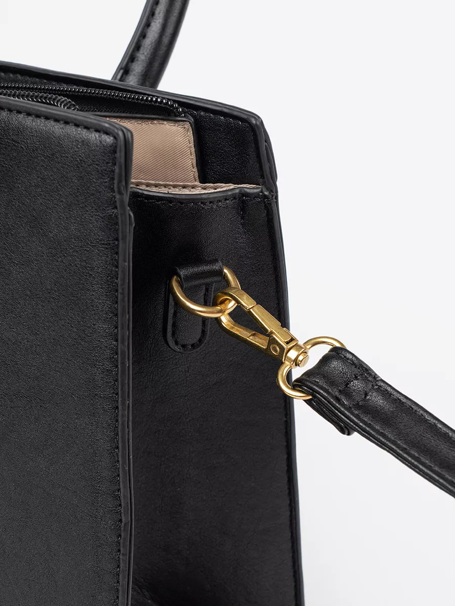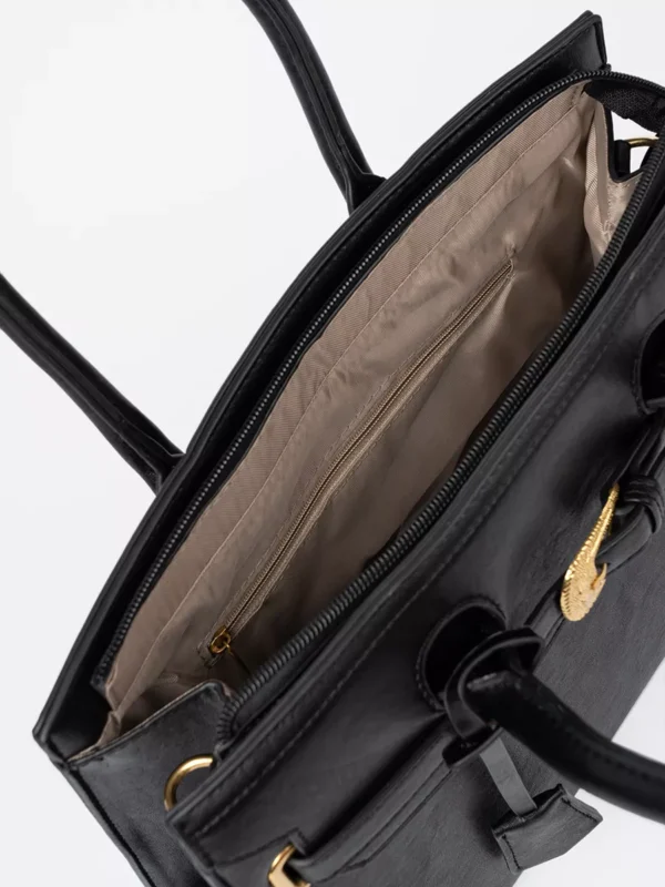 Ši juoda rankinė pasižymi ne tik stilingu dizainu, bet ir nepaprastu funkcionalumu. Erdvus vidus leis sutalpinti visus svarbiausius daiktus: nuo piniginės ir telefono iki makiažo priemonių ar nedidelio planšetinio kompiuterio. Specialiai suprojektuotos vidinės kišenėlės padeda palaikyti tvarką, kad visada rastumėte tai, ko ieškote. Rankinės tvirta rankena ir reguliuojamas peties dirželis suteikia lankstumo ir komforto naudojimo metu. Nesvarbu, ar keliaujate į darbą, ar ruošiatės vakarėliui, ši rankinė taps jūsų nepakeičiama palydove, pabrėžiančia jūsų nepriekaištingą skonį ir asmeninį stilių.