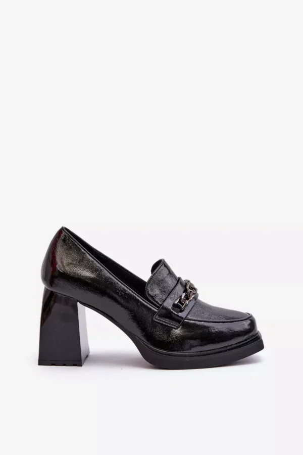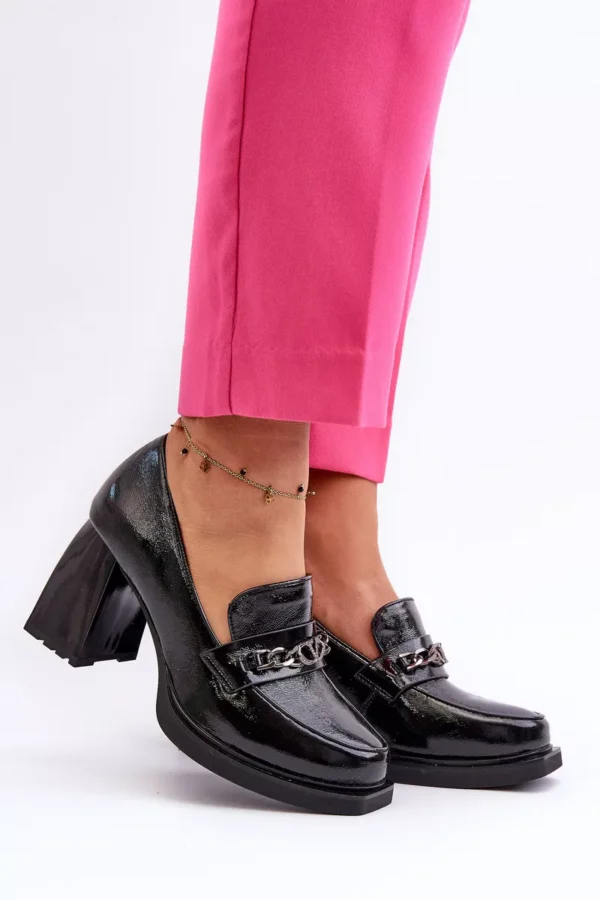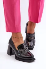 Odiniai bateliai yra puikus pasirinkimas kiekvienai moteriai, vertinančiai madingą ir patogią avalynę! Šis modelis yra ant subtilios platformos ir masyvaus, aukšto stulpo formos kulno. Be to, jie turi standintą kulną. Priekis puoštas dirželiu ir grandinėle. Puikus modelis įvairioms stilizacijoms! Pasirinkdami dydį, vadovaukitės dydžių lentelės.