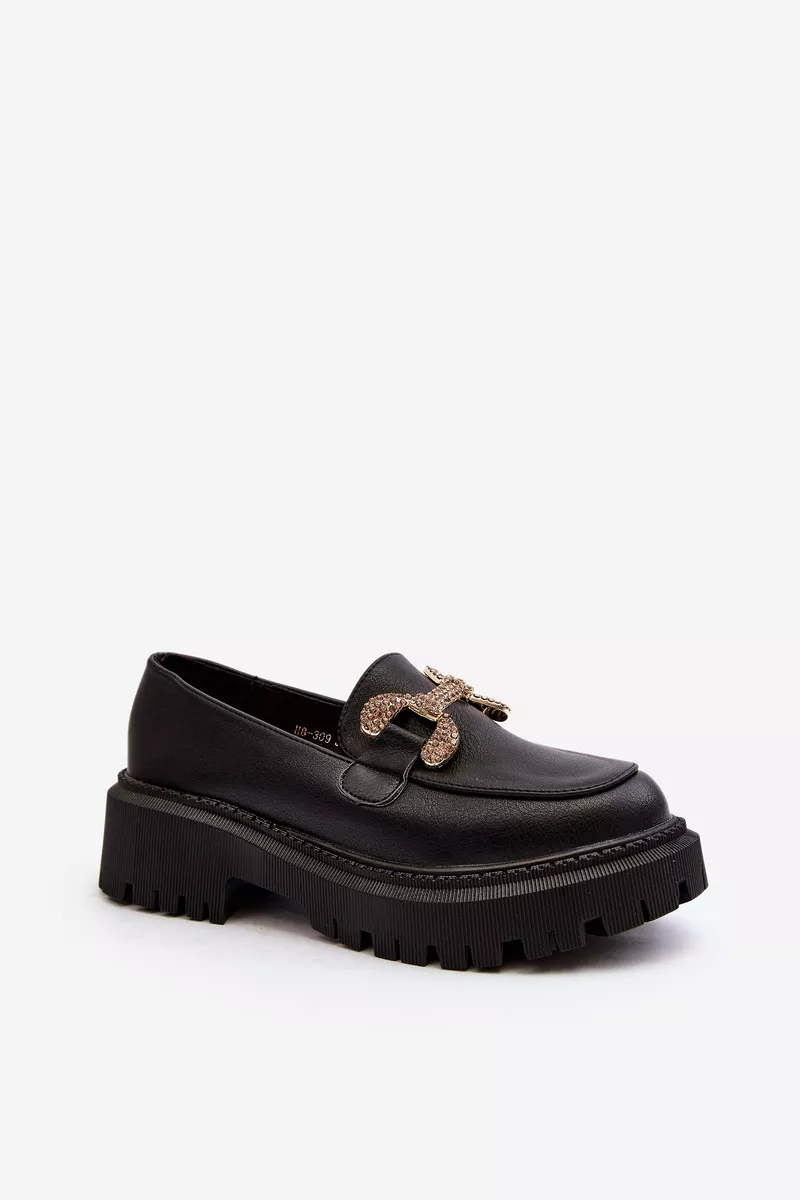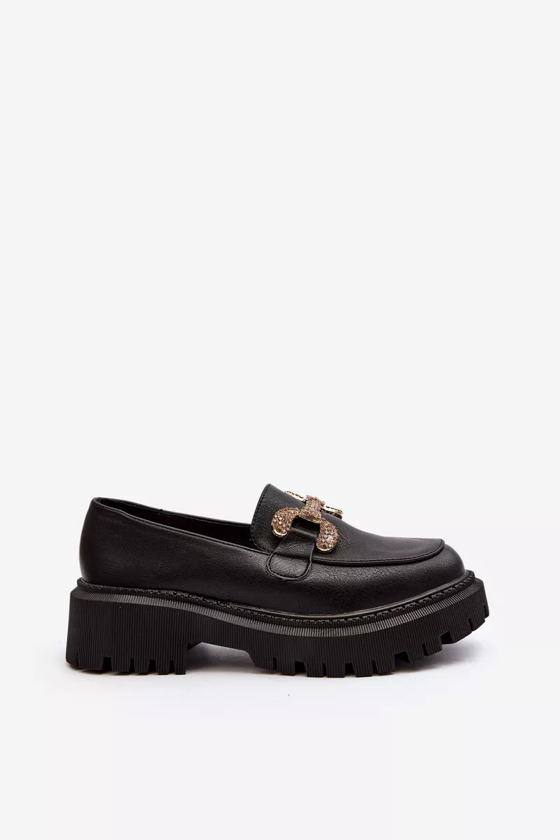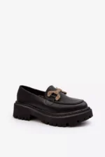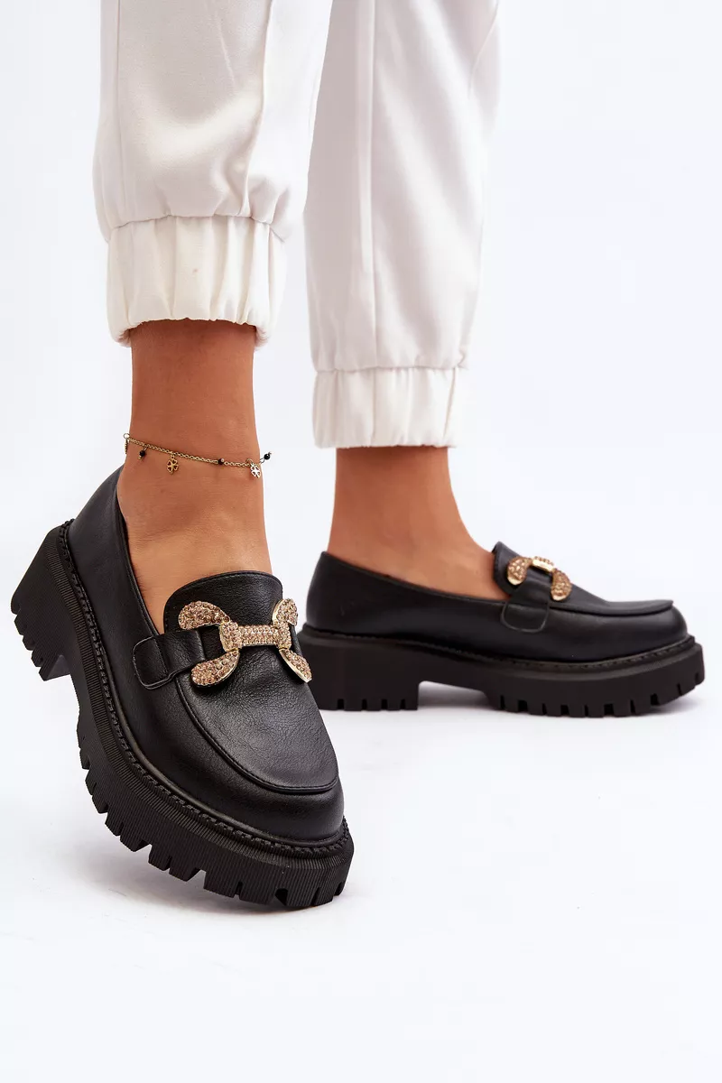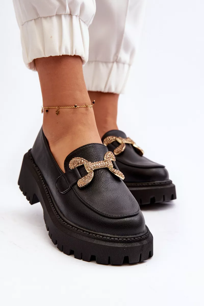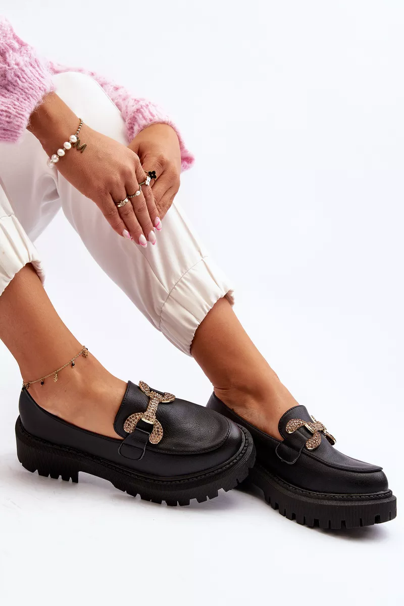 Moteriški mokasinai, pagaminti iš ekologiškos odos. Tvirtas, plokščias kulnas ir stora padas. Šis modelis turi apvalius pirštus ir auksinį papuošimą priekyje. Jie tikrai turėtų būti jūsų garderobe! Renkantis dydį, prašome remtis dydžių lentele.
