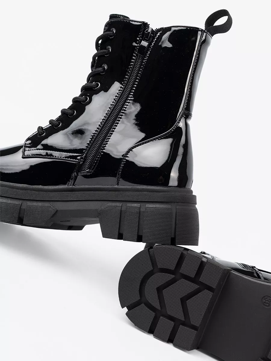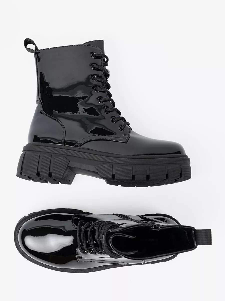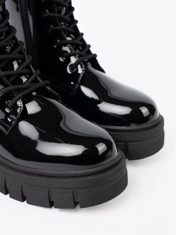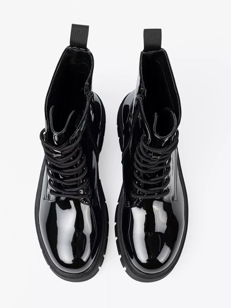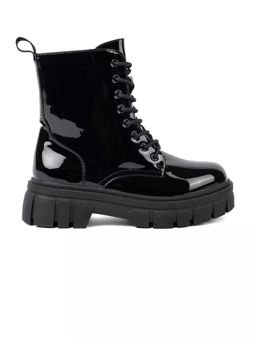 Šie grublės batai yra pagaminti iš aukštos kokybės dirbtinės odos, kuri yra ne tik patvari, bet ir lengvai prižiūrima, išlaikant originalią išvaizdą ilgą laiką. Lakuotas paviršius atspindi šviesą, todėl batai atrodo ypač prabangiai ir efektingai. Klasikinė juoda spalva leidžia juos lengvai derinti su įvairiausiais drabužiais – nuo džinsų ir megztinių iki suknelių ir sijonų. Storas, raižytas padas suteikia batams solidumo ir užtikrina stabilumą žingsniuojant įvairiu reljefu. Tai puikus pasirinkimas moterims, vertinančioms tiek madą, tiek funkcionalumą.