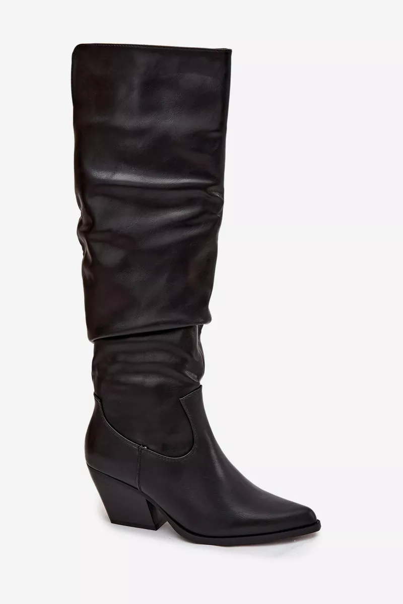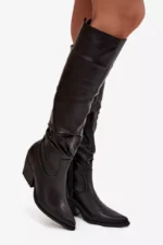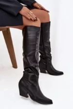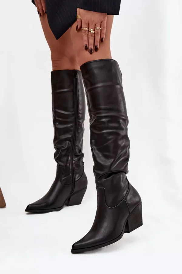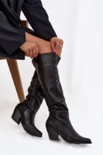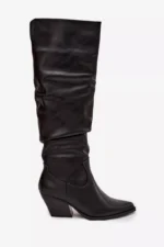 Moteriški kaubojiški batai, pagaminti iš eko odos. Jie išsiskiria būdingu susiraukšlėjimu ant bato aulo ir smailiais priekiais. Įtvirtinti ant stabilaus, nupjauto stulpelio formos kulno, jie užtikrina komfortą ir pasitikėjimą žingsniu. Batai užsegami užtrauktuku, todėl juos lengva apsiauti. Putplasčio pamušalas, padengtas audiniu, garantuoja šilumą ir patogumą vėsesnėmis dienomis. Tai puikus pasirinkimas moterims, mėgstančioms vakarietišką stilių elegantiškoje versijoje – puikiai tinka su suknelėmis, sijonais ar prigludusiomis kelnėmis. Rinkdamiesi dydį, vadovaukitės dydžių lentelę.