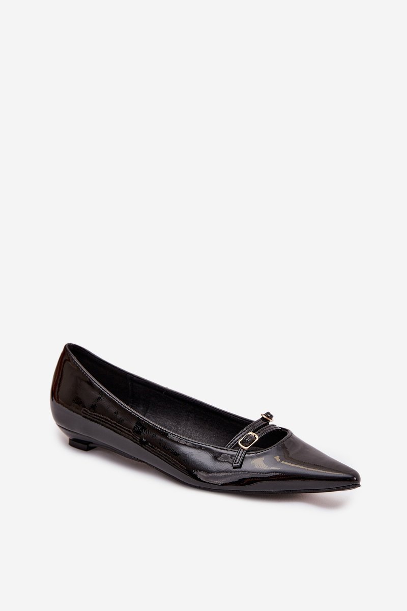 Balerinai pagaminti iš lakuotos eko odos. Modelis su subtiliu kulniuku suteikia lengvą pakilimą ir komfortą nešiojant. Priekyje jį puošia du ploni dirželiai su auksinėmis sagtimis, suteikiantys visumai ypatingą, elegantišką charakterį. Smaili noselė optiškai lieknina pėdas, pabrėždama jų subtilią formą. Šios balerinos puikiai tiks tiek elegantiškiems biuro deriniams, tiek vakariniams išėjimams, kai norite atrodyti stilingai ir jaustis patogiai visą dieną. Renkantis dydį, prašome vadovautis dydžių lentele.
