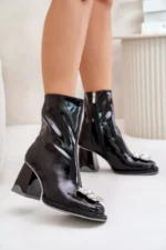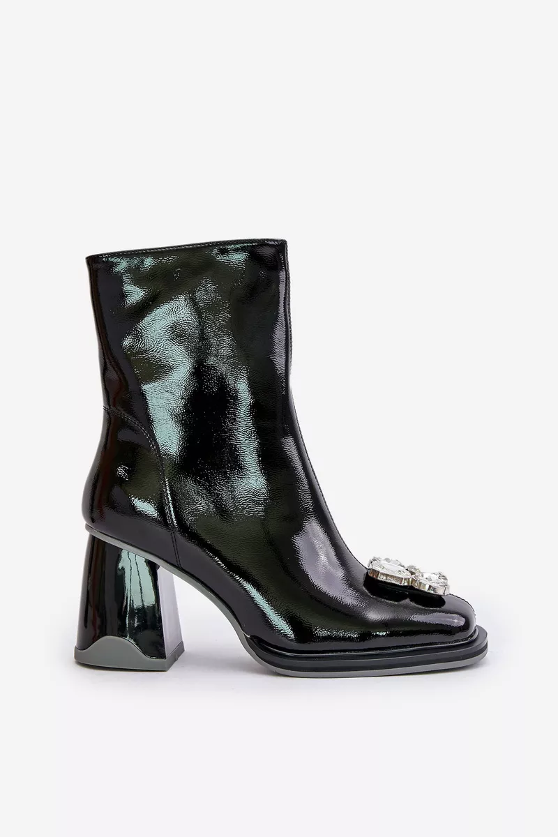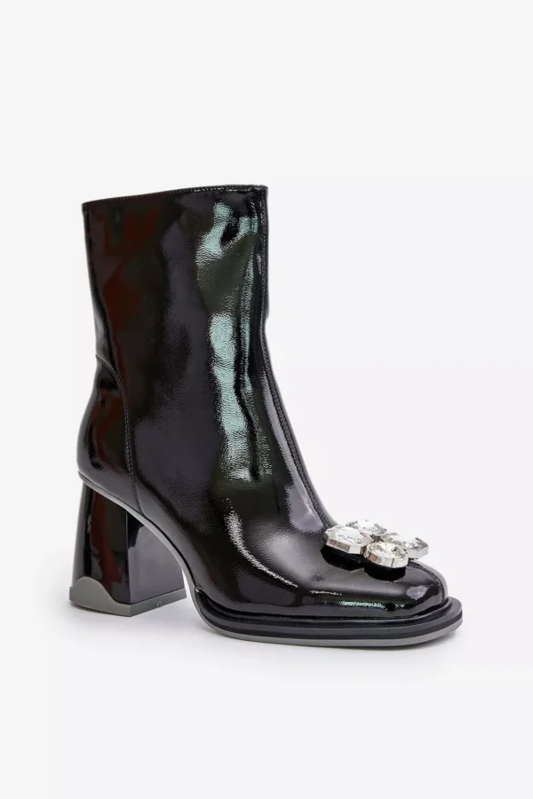 Lakuoti moteriški batai ant kulno su dekoracija MR880-019 iš juodos D&A odos puikiai atitinka stilingos moters poreikius. Pagaminti iš ekologiškos odos, šie batai yra ne tik draugiški aplinkai, bet ir ilgaamžiai. Priekis papuoštas deimanto elementais suteikia batai puošnumo, o kvadratinės noselės prideda modernumo ir stiliaus.