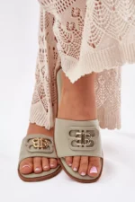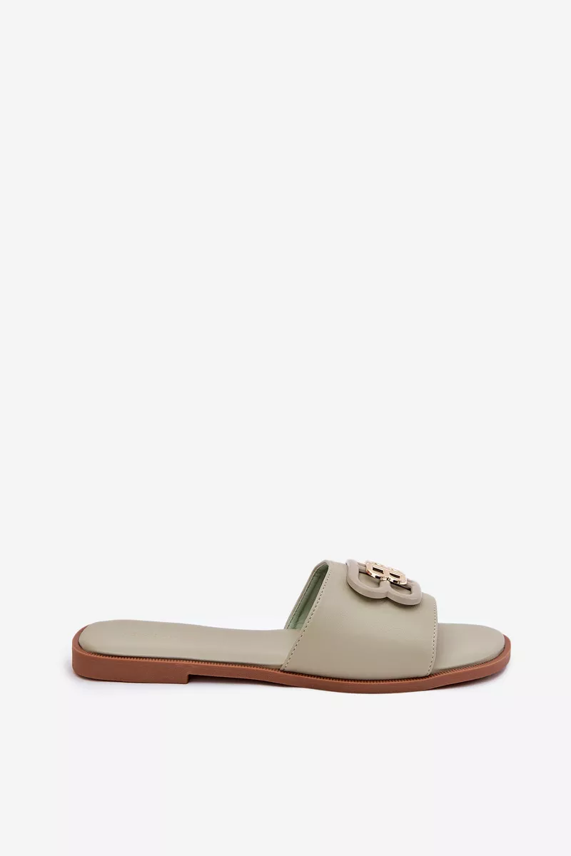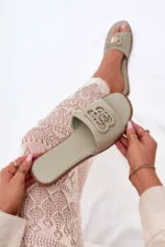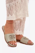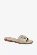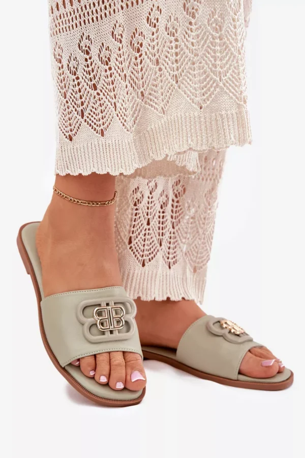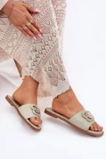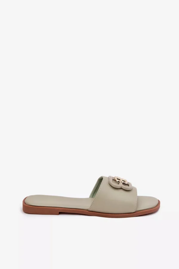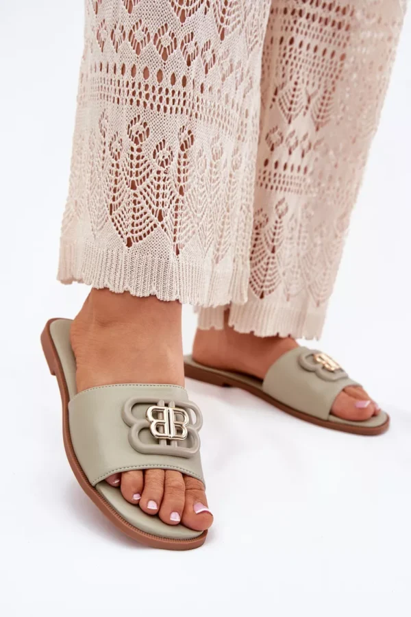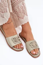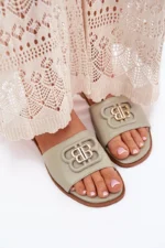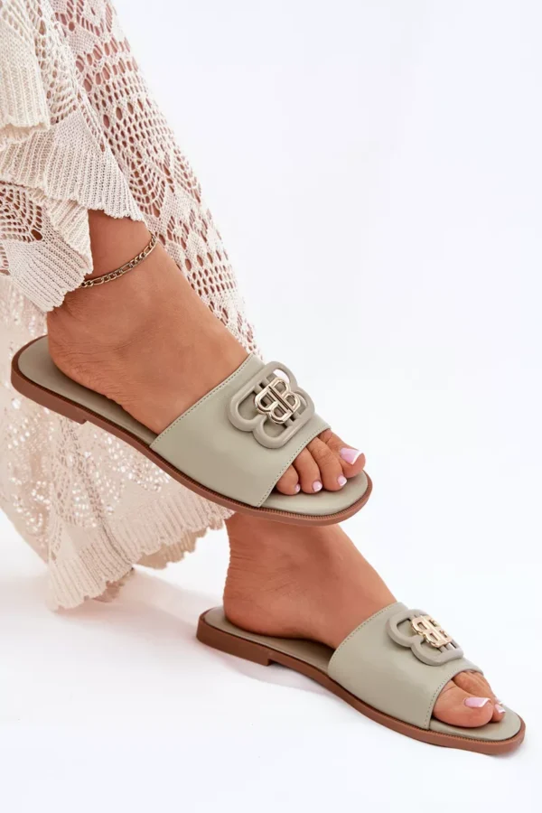 Plokšti moteriški sandalai su dekoratyviniu akcentu žalios spalvos yra elegantiškas pasirinkimas šiltoms dienoms. Sandalai yra sukurti su lygiu padu, kuris užtikrina komfortą bei ilgaamžiškumą. Viršutinė dalis puošia subtilus dekoratyvinis elementas, suteikiantis sandalams unikalumo. Pagaminti iš minkštos, ekologiškos odos, todėl užtikrinama patogi prigludimo prie pėdos.
