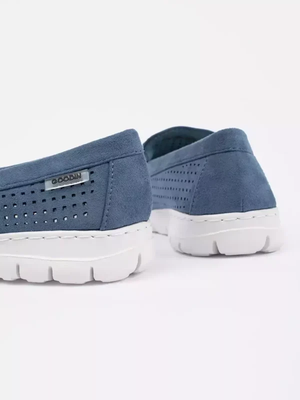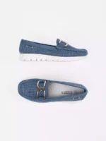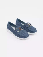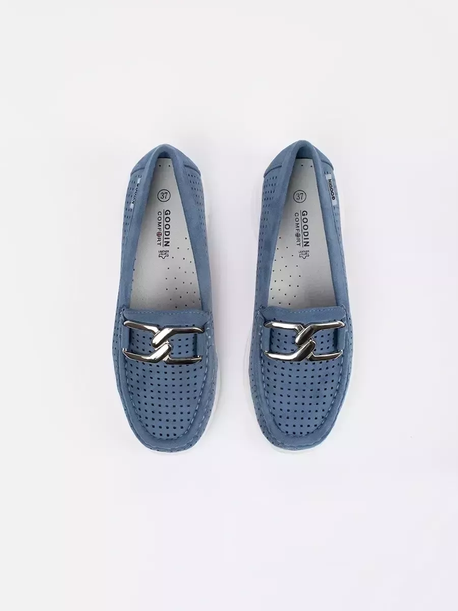 Mėlynos mokasinai su dekoratyvine grandine yra elegancijos ir patogumo derinys. Šios mokasinai pagaminti iš kokybiškos odos, kuri ne tik užtikrina ilgaamžiškumą, bet ir suteikia prabangos pojūtį. Subtili blauzdų dekoracija su metaline grandine prideda sofistikuotumo, suteikdamas joms unikalų stilių, kuris nepaliks abejingų.