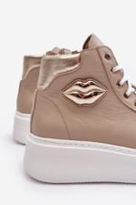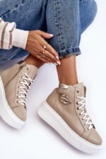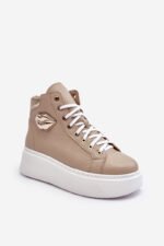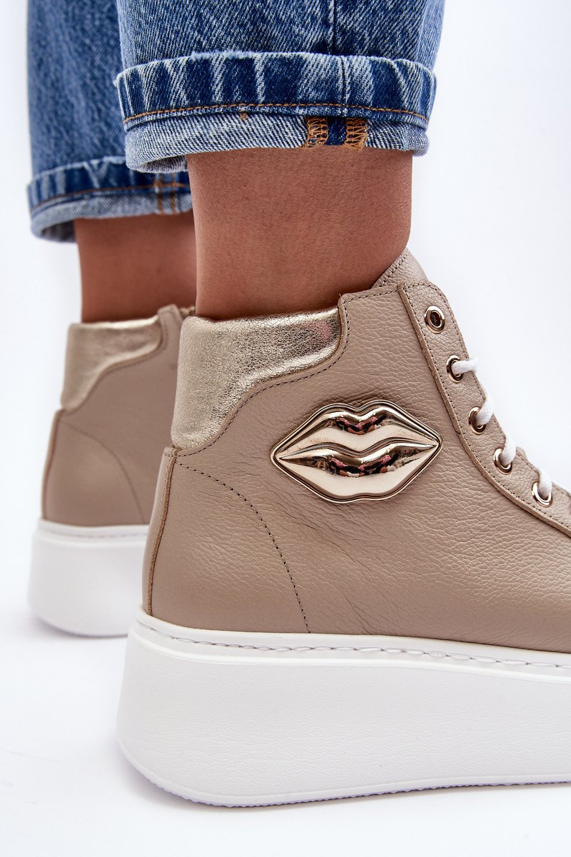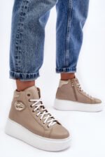 Aukštos, moteriškos sportbačiai pagaminti iš natūralios odos. Jie turi raištelius ir užtrauktuką ant aulo šono. Šis patogus modelis yra ant masyvios platformos. Vidpadis taip pat pagamintas iš natūralios odos. Klasikinis dizainas, patogus kirpimas ir madinga apdaila išskiria šiuos sportbačius iš kitų modelių! Renkantis dydį, prašome vadovautis dydžių lentele.