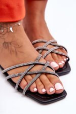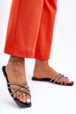 Elegantiškos moteriškos šlepetės pagamintos iš tekstilinės viršutinės dalies. Priekyje esančios juostelės susipina viena su kita ir yra papuoštos deimantus imituojančiais cirkonio akmenukais. Šlepetės turi minkštą ir patogią ekoodos įdėklą. Tai idealūs batai įvairioms stilizacijoms karštomis dienomis! Būtinai turėtumėte juos įsigyti! Pasirinkdami dydį, prašome vadovautis dydžių lentele.