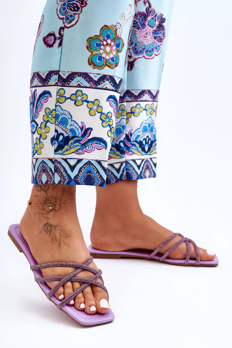 Šie įspūdingi moteriški sandalai su dirželiais ir diamantiniais akmenėliais puikiai papildys bet kokį vasaros garderobą. Jie sukurti su elegantiškais susuktų dirželių ornamentais, puoštomis blizgančiais kalnų krištolais, suteikiančiais prabangos ir stiliaus pojūtį kiekvienam žingsniui. Pagaminti iš aukščiausios kokybės medžiagų, sandalai žavi dėmesį traukiančiu purpuriniu atspalviu, kuris iškart patrauks aplinkinių dėmesį.