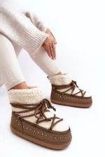 Unikalūs moteriški sniego batai pagaminti iš šalčiui ir vėjui atsparios medžiagos. Dirbtinio kailio aulas su kniedėmis puikiai tiks rudens-žiemos sezonui. Klasikinis modelis su papildomais raišteliais. Sniego batai yra ant masyvios platformos. Viduje yra putplasčio ir apmušalo paminkštinimas, užtikrinantis aukštą apsaugą šaltomis dienomis. Renkantis dydį, prašome vadovautis dydžių lentele.