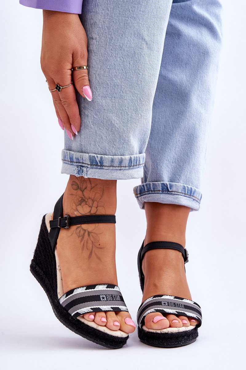Patogūs, moteriški sandalai pagaminti iš tekstilinės medžiagos su Big Star prekės ženklo logotipu. Įmontuoti ant platformos ir pakulnės. Neslystantis padas pagamintas iš guminės medžiagos. Pakulnė ir platforma papuoštos pynimu. Sandalai turi užsegimą klasikiniu sagties dirželiu su reguliuojamu dirželiu. Rinkdamiesi dydį, vadovaukitės dydžių lentele.