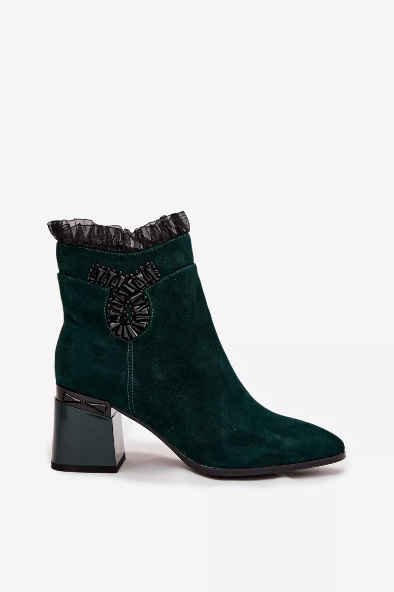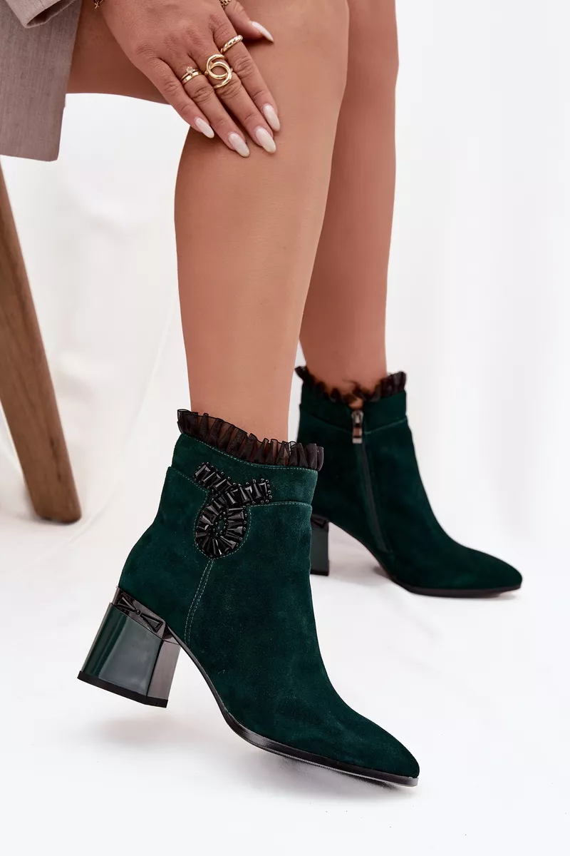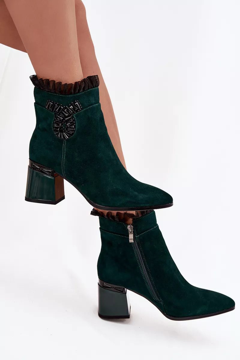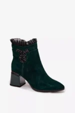 Aukštos kokybės zomšos ir odos naudojimas garantuoja patvarumą, o tamsiai žalia spalva suteikia išskirtinumo bei prabangaus pojūčio. Batai yra apsupti švelniai klostuotu audiniu, suteikdami moteriškumo ir elegancijos. Puikus pasirinkimas tiek kasdienei, tiek šventinei aprangai per rudens ir žiemos sezonus.