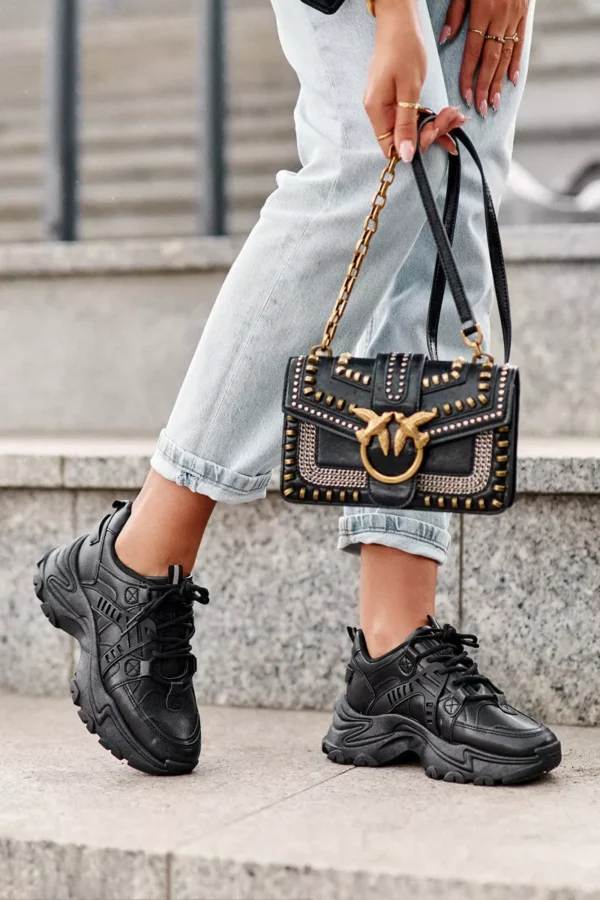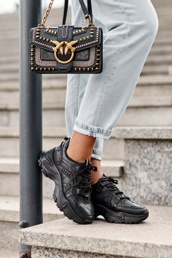 Eleganti damos sportiniai bateliai su storu padu ir platforma, puikiai derantys tiek prie laisvalaikio, tiek prie sportinio stiliaus drabužių. Pagaminti iš ekologiškos odos, jie išsiskiria ne tik savo dizainu, bet ir patvarumu. Juoda spalva suteikia universalumo, todėl šie sportiniai bateliai bus nepakeičiamas jūsų kasdienės aprangos elementas.