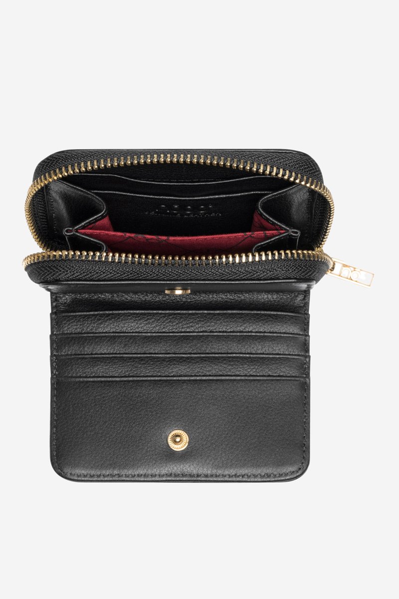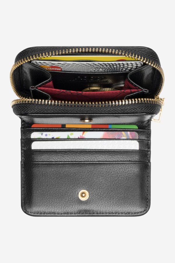 Mažytė moteriška piniginė pagaminta iš lygios natūralios odos. Viduje yra dvylika kišenėlių kortelėms. Užtrauktuku užsegamoje kišenėlėje yra skyrius, kuriame galėsite laikyti banknotus ir monetas. Modelis supakuotas į elegantišką raudoną dėžutę. Puikiai tinka dovanai!