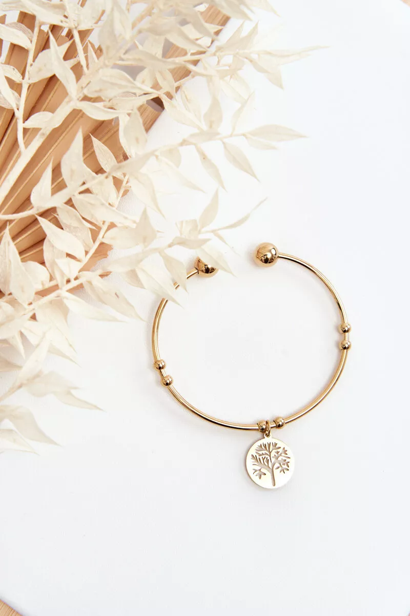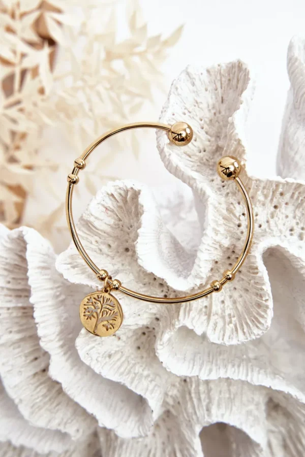 Apyrankė yra lengvai užmaunama ir nepaprastai patogi bet kokiai riešo formai, nes reguliuojamas ilgis leidžia ją derinti pagal individualų poreikį. Jos viduryje bei galuose yra dekoratyvinės perlų detalės, suteikiančios aksesuarui prabangos akcentą. Apyrankė papildyta žavingu medžio motyvo pakabuku, kuris simbolizuoja augimą ir stiprybę.