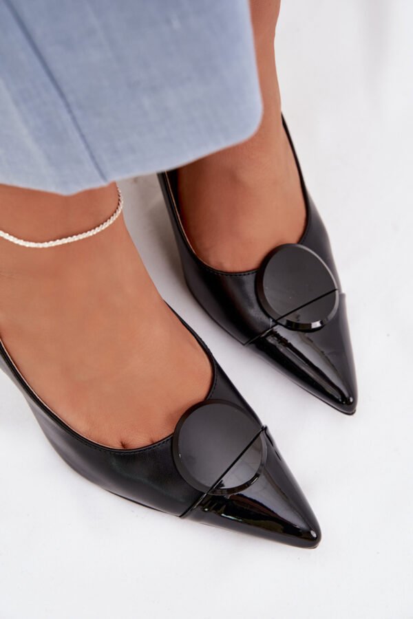 Ekologiškos odos moteriški sandalai puikiai tinka moterims, vertinančioms elegantišką stilių ir moteriškas detales. Smailūs pirštai vizualiai lieknina pėdą, pabrėždami batų linijos grakštumą. Stiletto kulnas suteikia siluetui lengvumo ir elegancijos. Priekyje yra dekoratyvinė detalė, kuri pritraukia dėmesį ir suteikia bateliams unikalų išvaizdą. Reguliuojamas dirželis su sagtimi leidžia pritaikyti batelius prie kojos, užtikrinant komfortą ir stabilumą. Šie stilingi sandalai puikiai tinka elegantiškoms išvykoms ir ypatingoms progoms.
