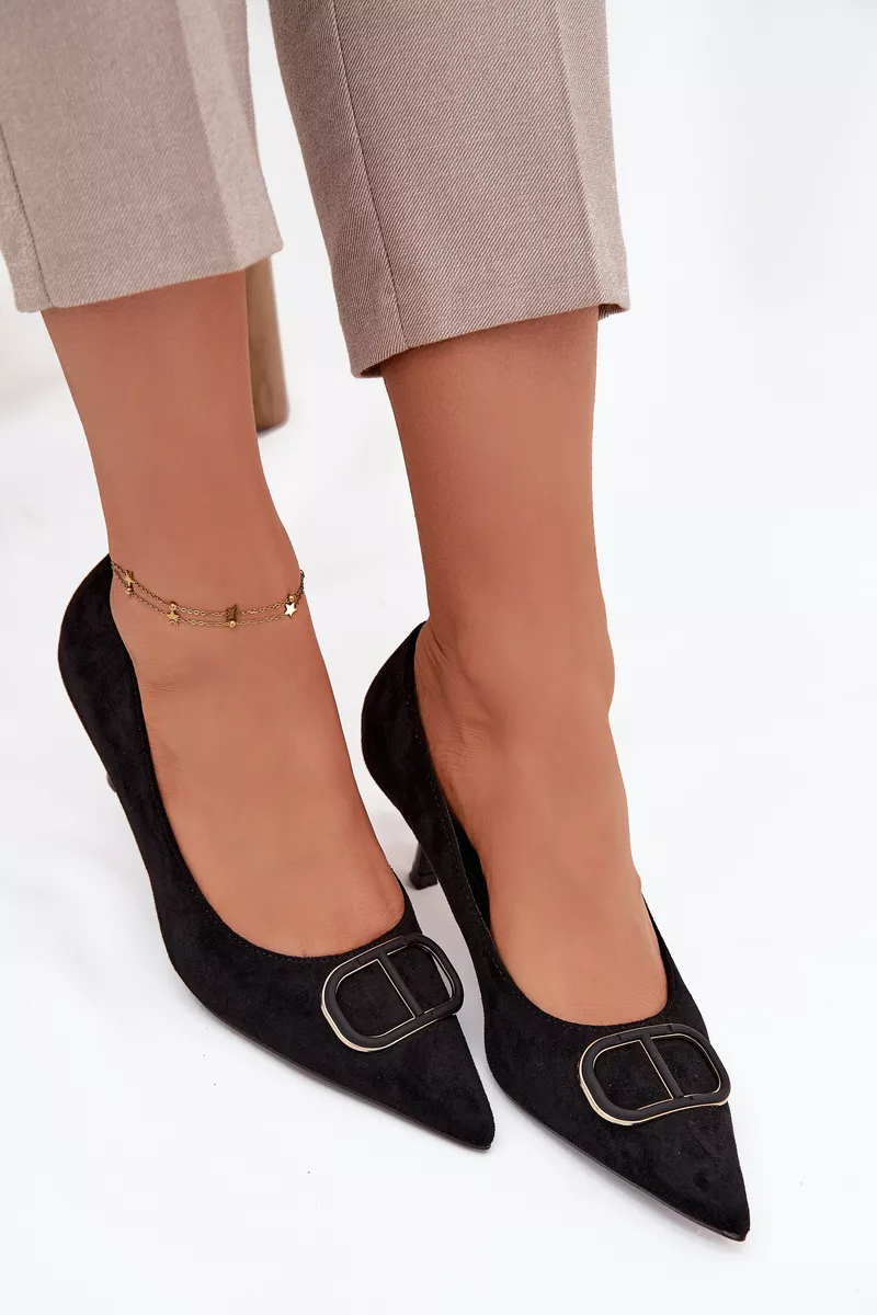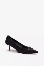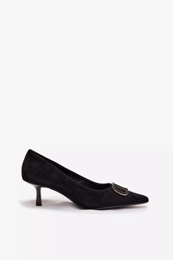 Moteriški aukštakulniai, pagaminti iš ekologiško zomšo. Modelis žavi klasikine linija ir smailu priekiu, kuris vizualiai lieknina kojas ir suteikia figūrai lengvumo. Ant batų priekio yra dekoratyvus elementas, kuris traukia akį ir suteikia visumai ypatingumo – tai nedidelis akcentas, pabrėžiantis skoningą avalynės dizainą. Dėl stabilaus, plono kulniuko batai gražiai atrodo ant kojos ir suteikia elegantišką užbaigtumą bet kokiai stiliacijai. Puikiai tinka tiek prie vakarinių suknelių, tiek prie elegantiškų biuro derinių.