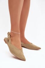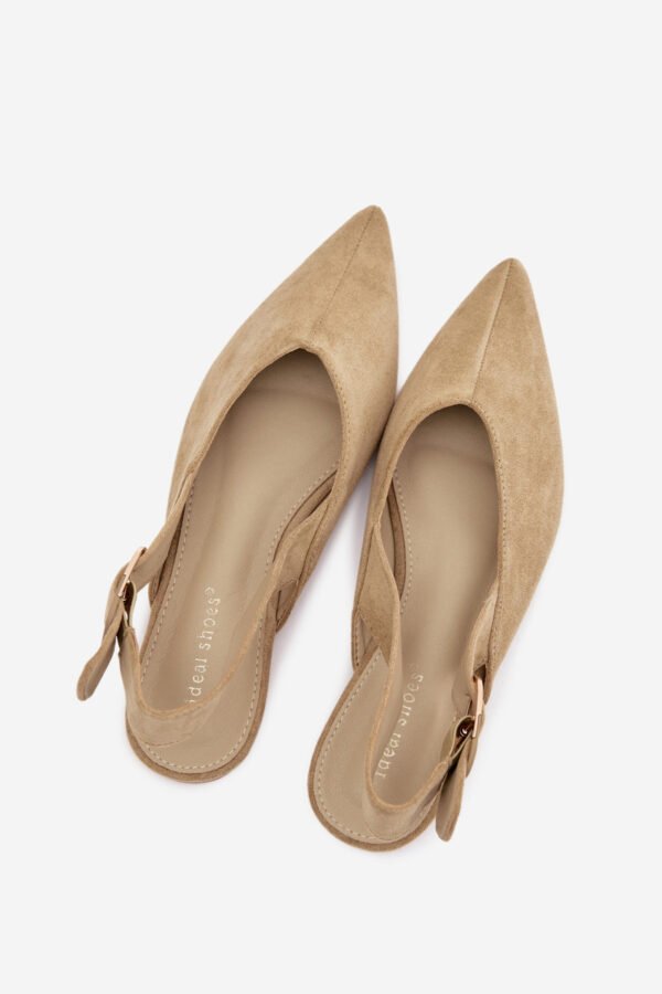Moteriškos balerinos, pagamintos iš ekologiško zomšo, yra stilingas ir patogus pasirinkimas kasdienai. Plokščio kulno modelis garantuoja patogumą, o smailūs priekiai suteikia elegancijos ir subtiliai lieknina pėdą. Nugaroje yra reguliuojamas dirželis su didele, dekoratyvine sagtimi, kuri patraukia dėmesį ir yra madingas akcentas. Tai balerinos, idealiai tinkančios moteriškiems, moderniems įvaizdžiams.