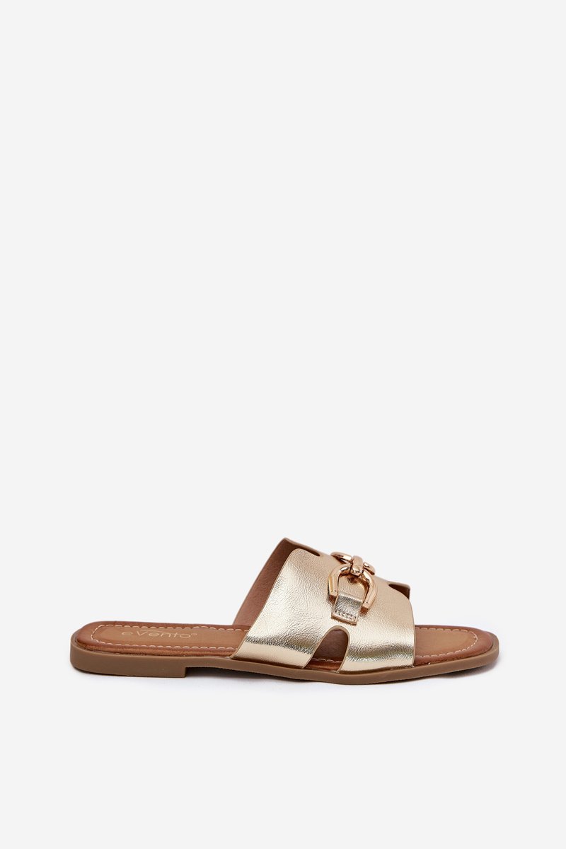 Moteriškos šlepetės pagamintos iš eko odos. Įtvirtintos ant plokščio kulno, jos užtikrina patogumą dėvint visą dieną. Priekyje yra subtilus, auksinis dekoratyvinis elementas, suteikiantis joms ypatingo charakterio. Idealios kasdieniam dėvėjimui, puikiai dera su atsitiktiniais drabužiais. Renkantis dydį, prašome vadovautis dydžių lentele.