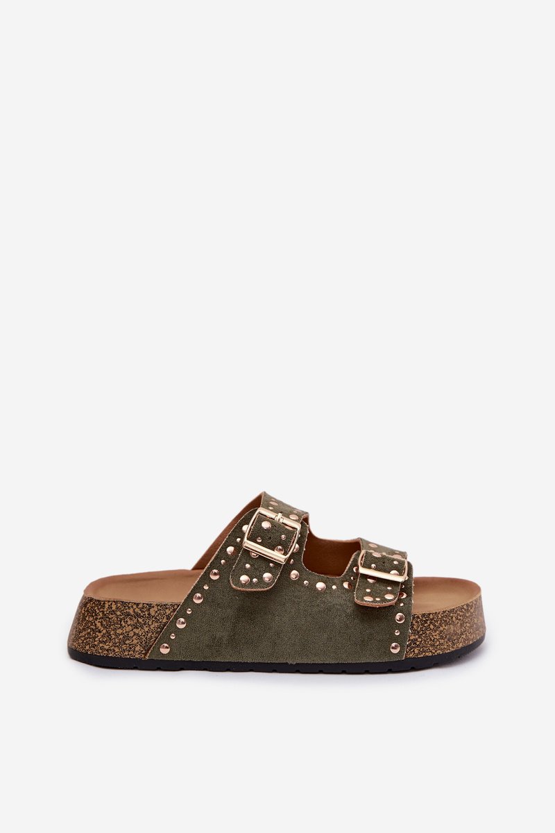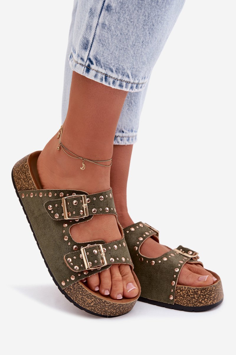 Moteriški plokšti tamsiai žali „Tervina“ šlepetės su auksiniais spaustukais ir kniedėmis