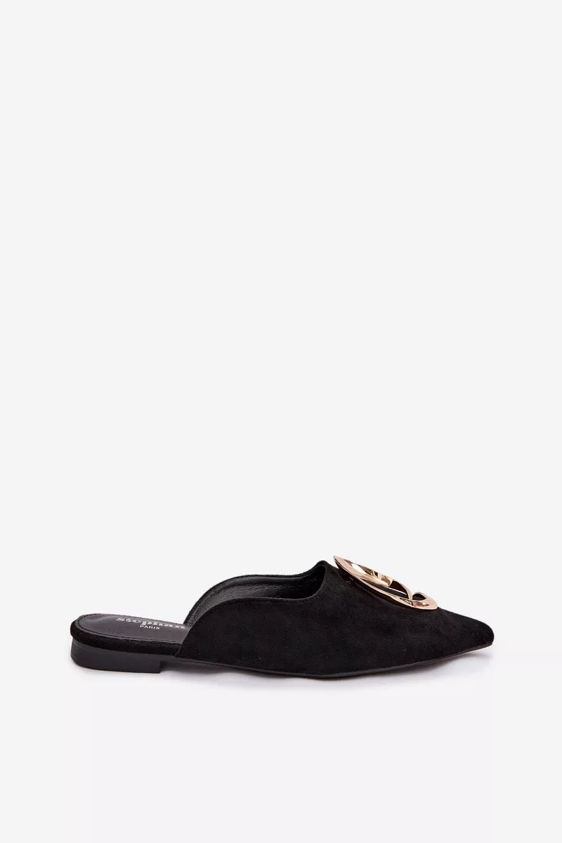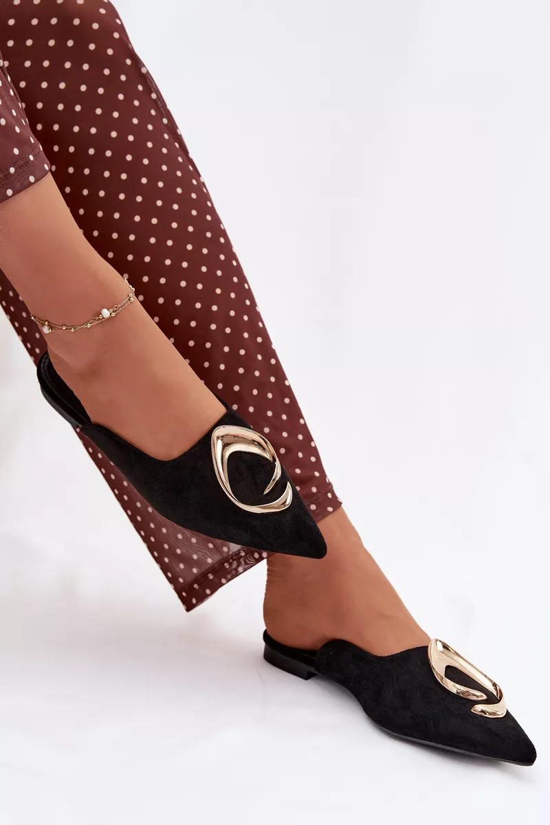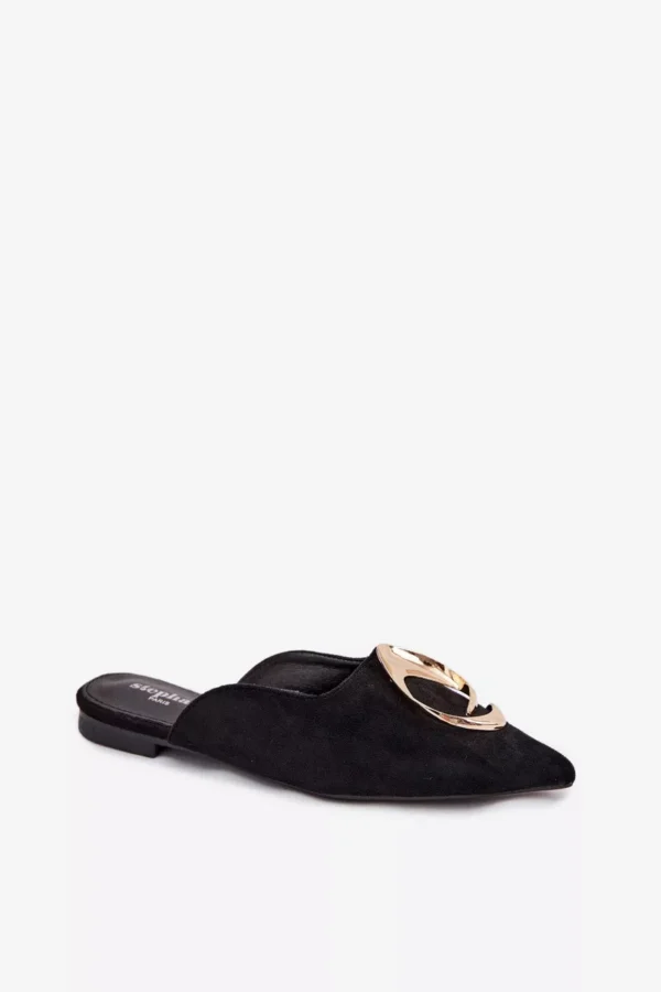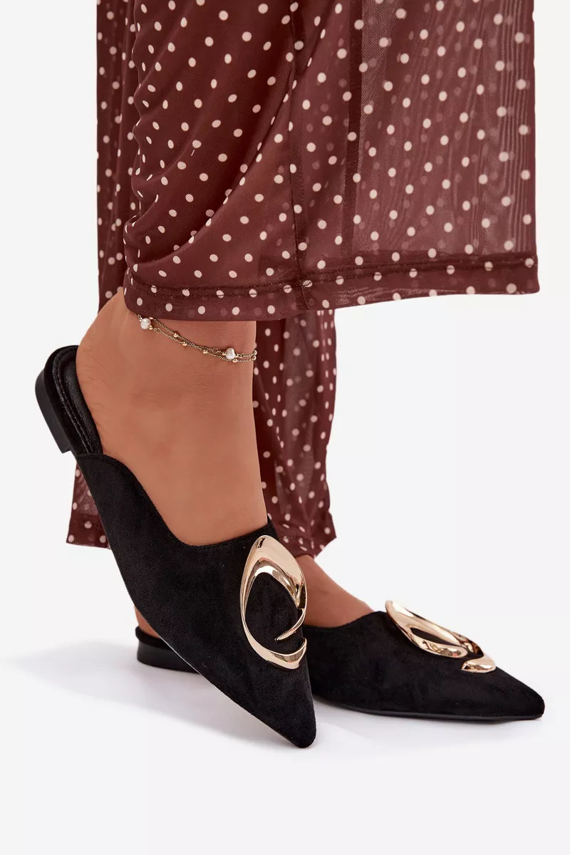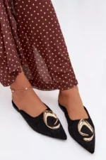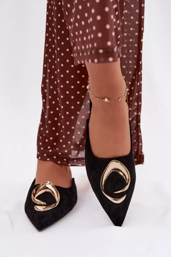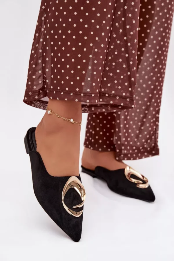 Šios elegantiškos moteriškos galvutės „Mule“, dekoruotos auksiniu detaliu, yra puikus pasirinkimas ieškantiems stiliaus ir komforto derinio. Juodos spalvos ir klasikinis dizainas leidžia lengvai derinti šias galvutes su įvairiausiais aprangos deriniais, o aplinkai draugiška medžiaga užtikrina tvarumą. Dėka uždarų, smailių pirštų, šios galvutės atrodo ypač elegantiškai ir išskirtinai.