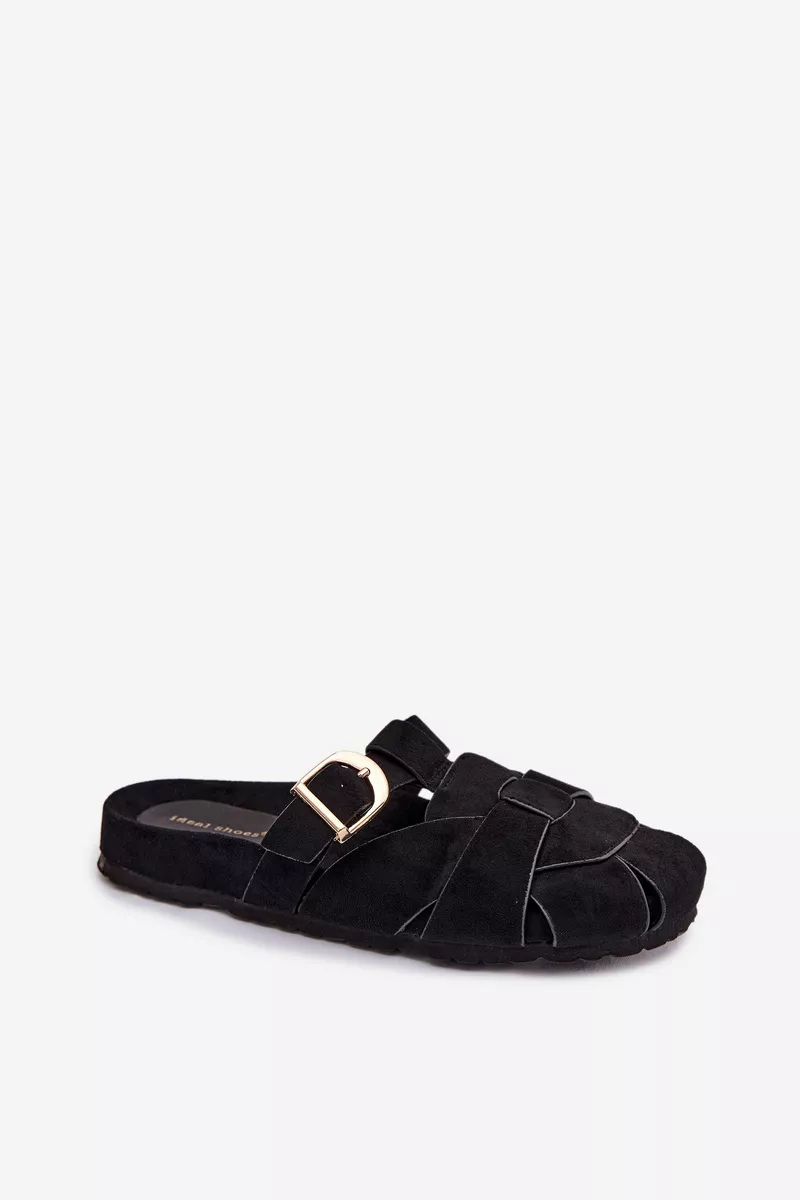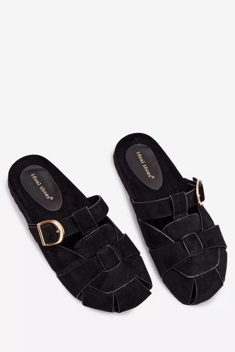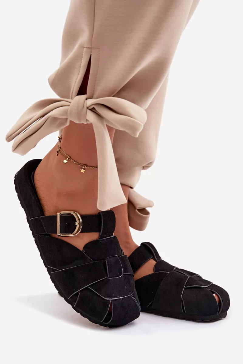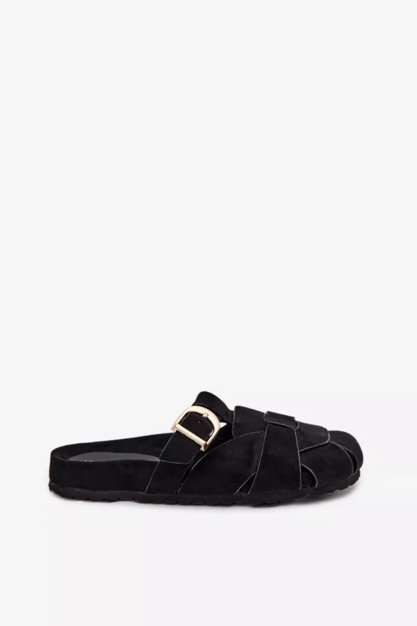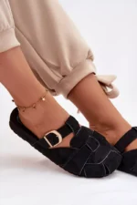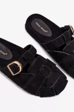Moteriški ekologiški suede mules sandalai derina komfortą ir madingą dizainą. Dirželiai su auksiniais užsegimais yra akį traukianti detalė, kuri suteikia stiliaus ir madingumo visam modeliui. Kontūrinė vidpadžiai užtikrina komfortą ir geresnį prigludimą. Šis modelis puikiai tinka kasdieniniams aprangos deriniams. Renkantis dydį, prašome remtis dydžių lentele.