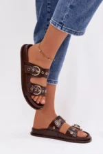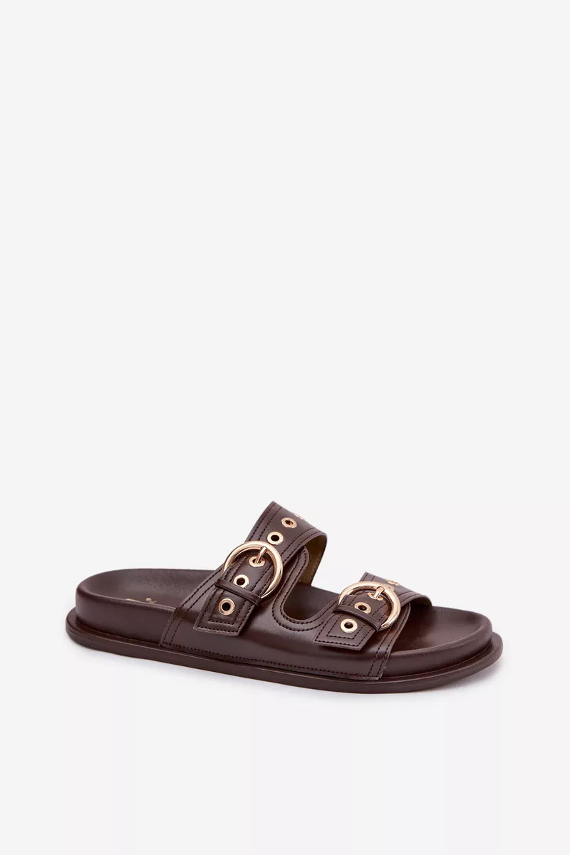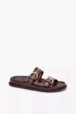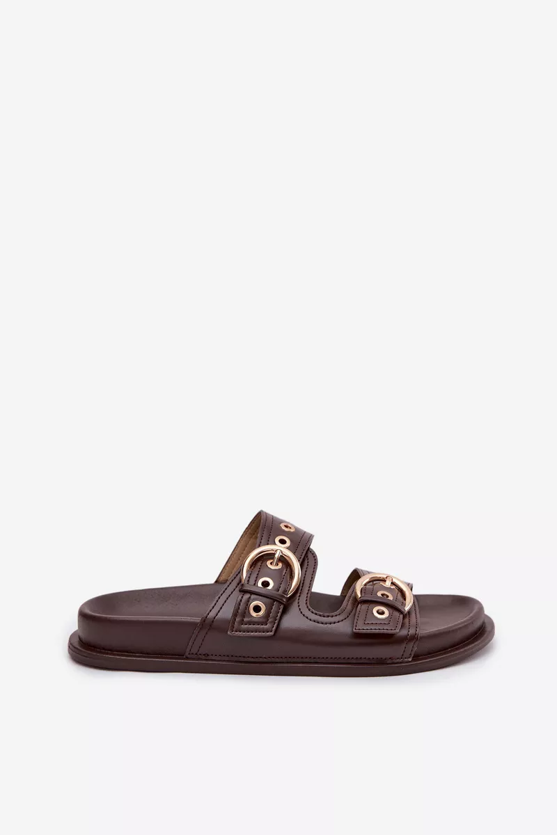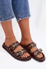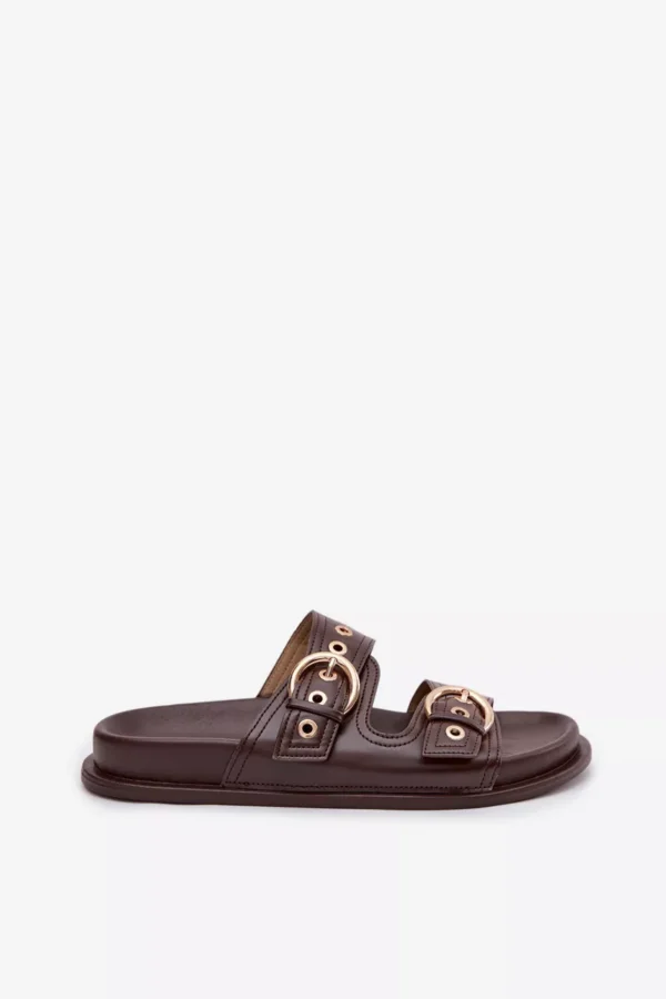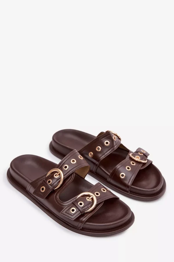 Šios išskirtinės moteriškos šlepės pagamintos iš ekologiškos odos ir yra puikus stilingo bei praktiško pasirinkimo pavyzdys. Jų ypatingas dizainas su dviem auksinėmis sagutėmis leidžia ne tik stilingai, bet ir patogiai priderinti šlepes prie pėdos. Šokoladinė spalva suteikia elegantišką išvaizdą, puikiai tinkančią bet kokioms kasdienėms situacijoms.