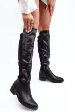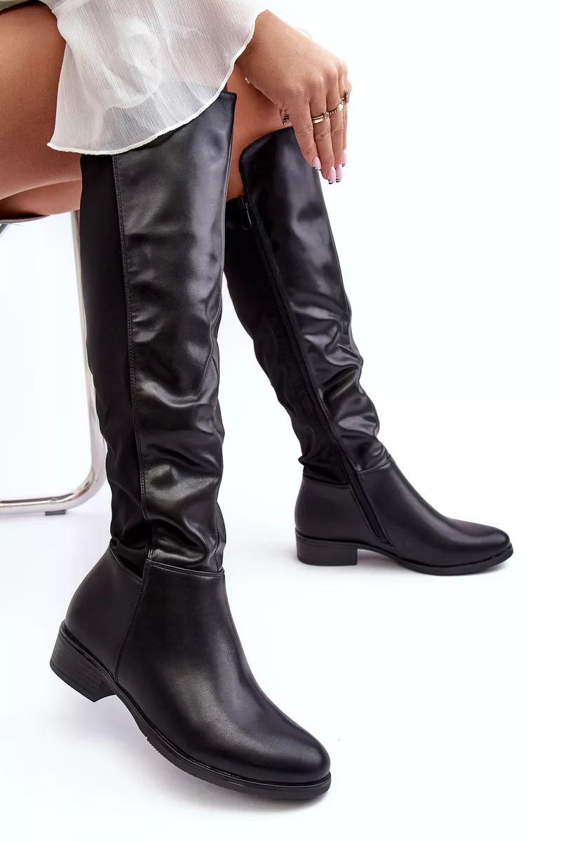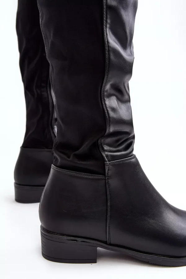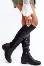 Moteriški batai, pagaminti iš ekologiškos odos ir tekstilės medžiagų derinio. Nustatykite ant plokščio kulno. Pirštai suapvalinti. Vidus iš dalies apšiltintas batų pamušalu. Be to, batai turi standžią kulkšnį. Viršutinė dalis prieš kelį. Neabejotinai naudosite juos daugeliui stiliaus variantų. Rinkdamiesi dydį, vadovaukitės dydžių lentele.
