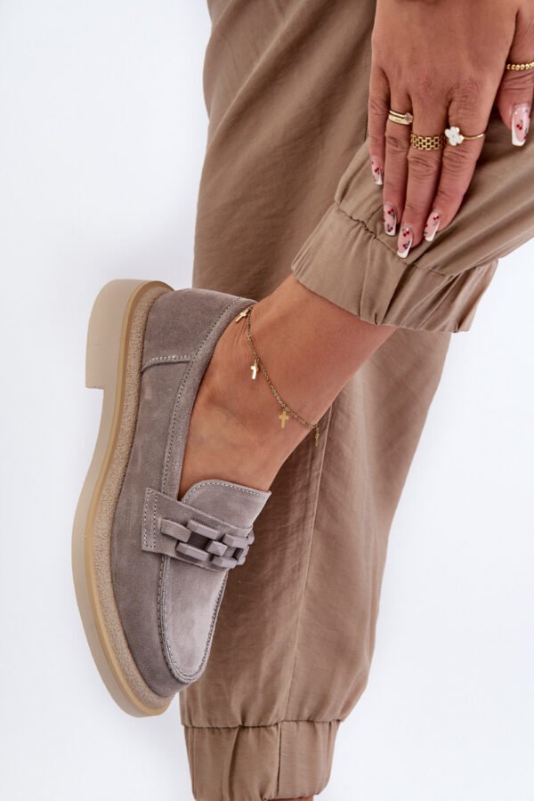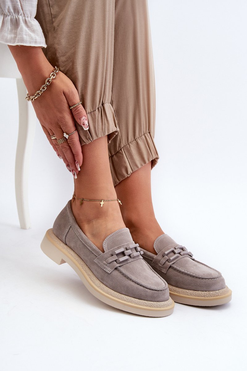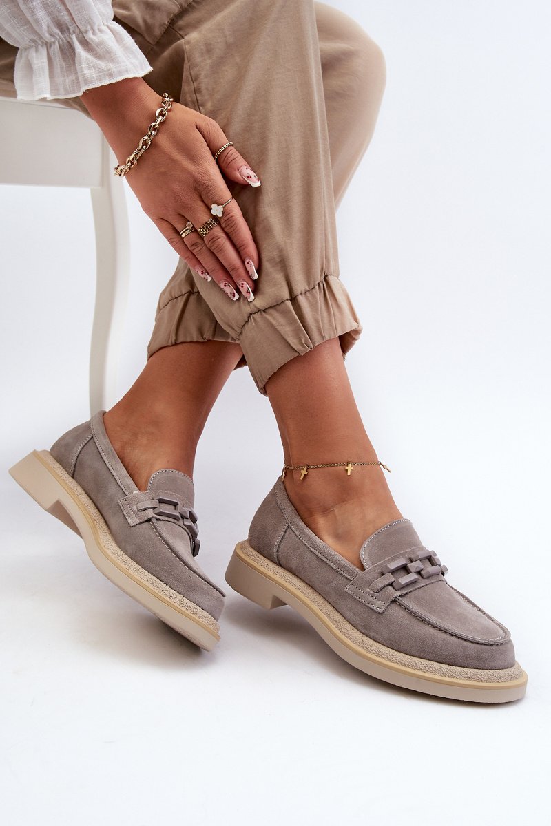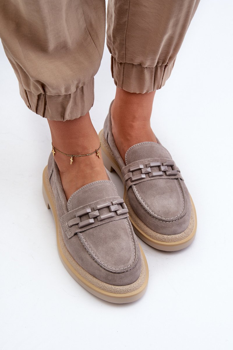 Moteriski mokasinai pagaminti iš natūralaus zomšos. Plokščias kulnas garantuoja stabilumą ir patogumą vaikščiojant. Papildomas dekoratyvinis elementas priekyje suteikia jiems originalumo, todėl jie yra ne tik praktiški, bet ir madingi. Šie mokasinai puikiai papildys daugelį skirtingų įvaizdžių, tiek laisvalaikio, tiek elegantiškesnių. Renkantis dydį, prašome vadovautis dydžių lentele.