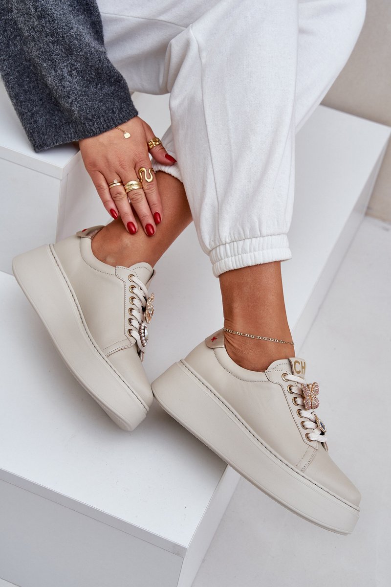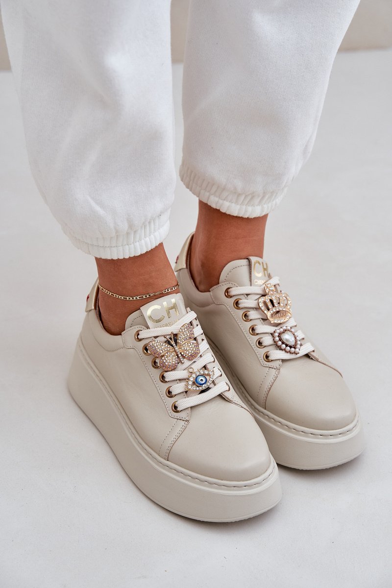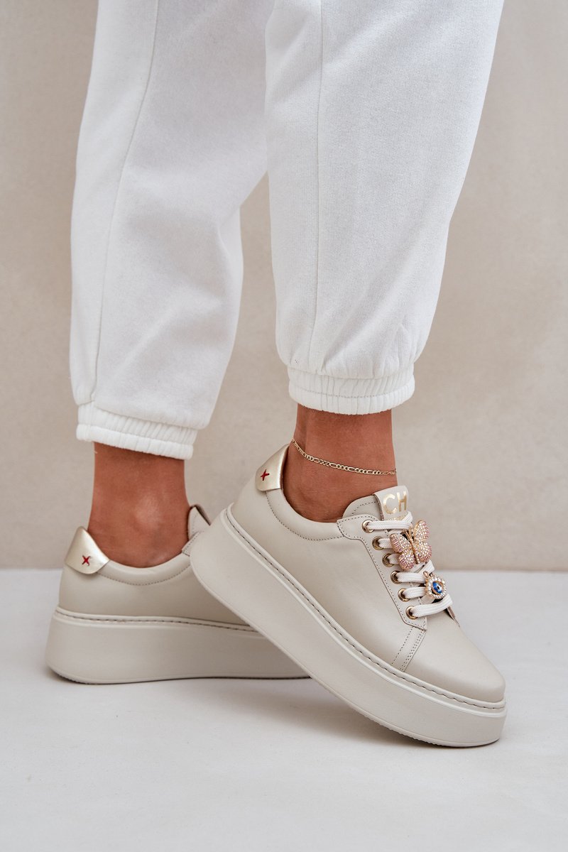 Moteriški odiniai platforminiai sportiniai bateliai su papuošimais CheBello 4292 Šviesiai smėlio spalvos