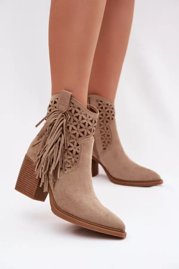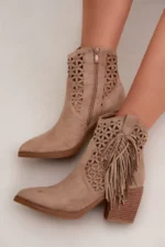 Jezzie prekės ženklo moteriški cowboy stiliaus kulniukai yra išskirtinė pasiūlymas moterims, kurios mėgsta ryškius akcentus savo įvaizdyje. Pagaminti iš ekologiško zomšos, atrodo stilingai ir dera prie madingo, vakarietiško įvaizdžio. Angiškas viršus, papuoštas kutais, suteikia lengvumo ir originalumo. Modelis su stabiliu blokiniu kulnu užtikrina patogumą vaikščiojant, o siauri priekiai vizualiai lieknina koją. Užsegimas užtrauktuku leidžia greitai užsidėti. Idealiai tinka boho stiliaus deriniams – tiek su suknelėmis, tiek su džinsais. Renkantis dydį, vadovaukitės dydžių lentele.