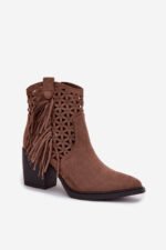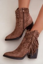 Būkite pirmas aprašęs “Moteriški perforuoti kaubojų batai su kulnais ir kutais, rudi „Calissey“”
