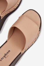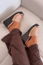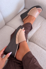 Stilingi moteriški sandalai, pagaminti iš ekologiškos odos. Klininis kulnas užtikrina stabilumą ir komfortą, tuo pačiu subtiliai lieknindamas figūrą. Auksinės kniedės šonuose prideda akį traukiančią detalę. Šis modelis puikiai tinka vasaros aprangai – tiek suknelėms, tiek kasdieniams ansambliams. Tai idealus pasirinkimas moterims, kurios vertina komfortą, derinamą su išskirtiniu, stilingu akcentu.