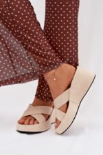 Moteriški platforminiai šlepetės iš ekologiškos odos, smėlio spalvos „Calorine“