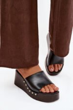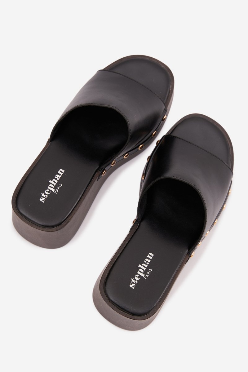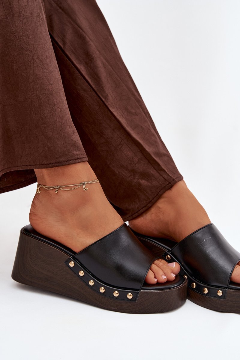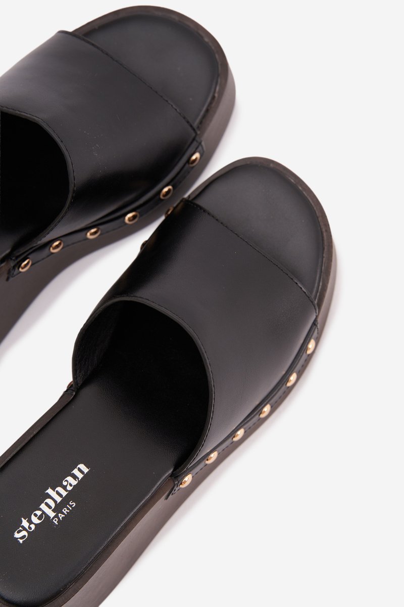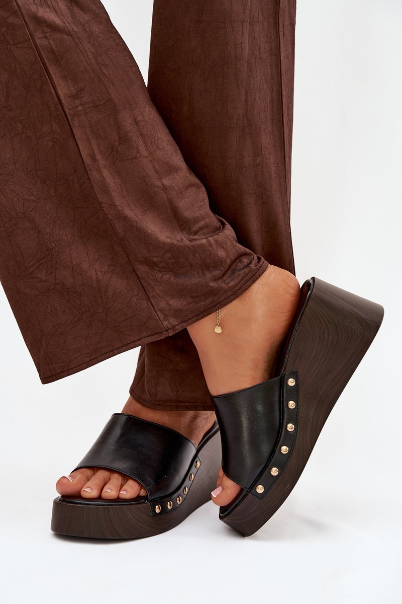 Stilingi moteriški sandalai, pagaminti iš ekologiškos odos. Klininis kulnas užtikrina stabilumą ir komfortą, tuo pačiu subtiliai lieknindamas figūrą. Auksinės kniedės šonuose prideda akį traukiančią detalę. Šis modelis puikiai tinka vasaros aprangai – tiek suknelėms, tiek kasdieniams ansambliams. Tai idealus pasirinkimas moterims, kurios vertina komfortą, derinamą su išskirtiniu, stilingu akcentu.
